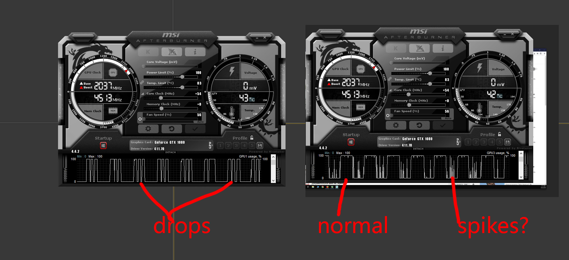 ..... Hello ,I would not overclocking.... Octane doesn't like overclocking . ++ he doesn't like the x1 express.coilbook wrote:Strange spikes in RC4 some of my slaves and master certain gpus would drop in power then come back. Not sure why and never saw in earlier versions. Why is it dropping?