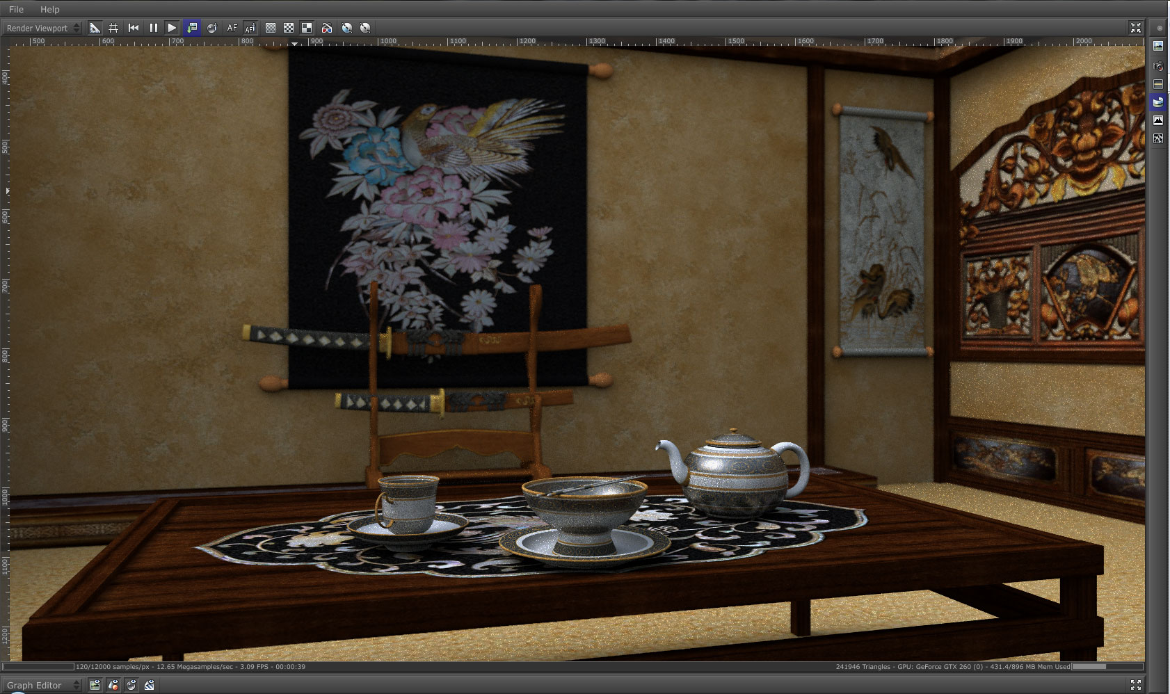 241,946 triangles rendered for exactly 1 hour on a GTX 260. I was actually surprised at how much you can squeeze out of 896MB of RAM. This scene w/2k HDRI took almost half of my GPU mem, very happy about that! :)