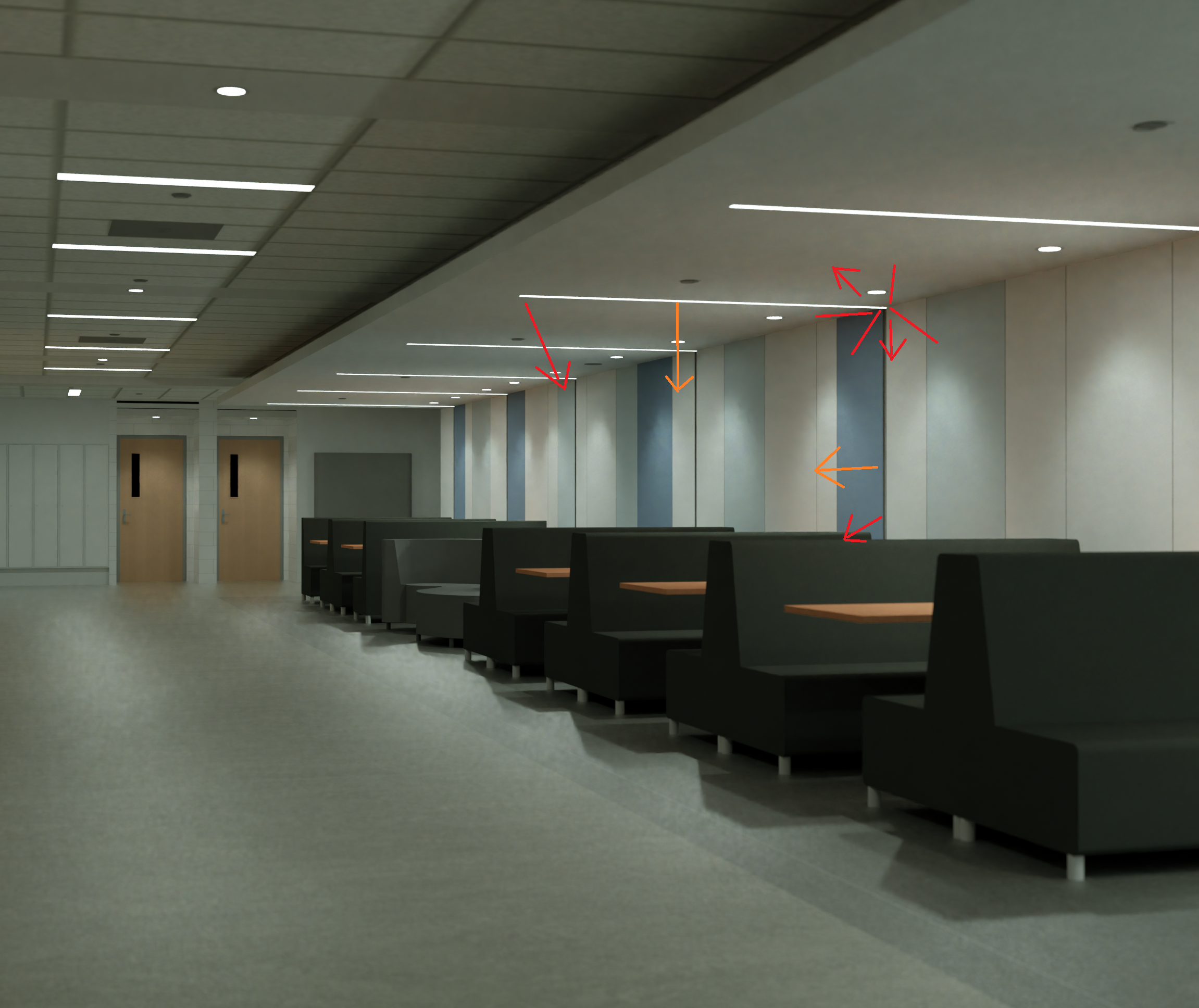 The orange shows that the light is emanating from the middle of the fixture, but iff it was emitting as a linear light, we would see a lot more light in the red areas, especially the corner where both lights meet and the bottom and extremities of the furniture.
