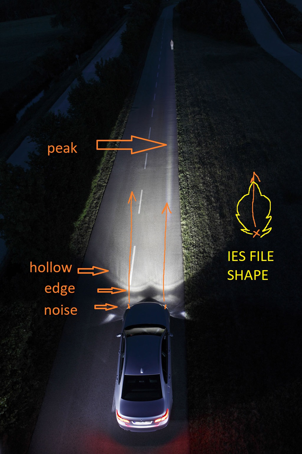 Here is a test with a PAR38. This is with the power set to the maximum of 100000, and exposure set at 20. You can see there is no distance throw, as you'd get from a headlight, and most of the light is right by the front of the car. Maybe I'm doing something wrong, but that's the same result I get with all the various IES lights I've tested in the past. Also shown is the custom spotlight I created with an Octane material, and that process is completely ridiculous, un intuitive and undocumented.SamuelAB wrote:I would use Photometric viewer to make a shape like this: It can surely be done.