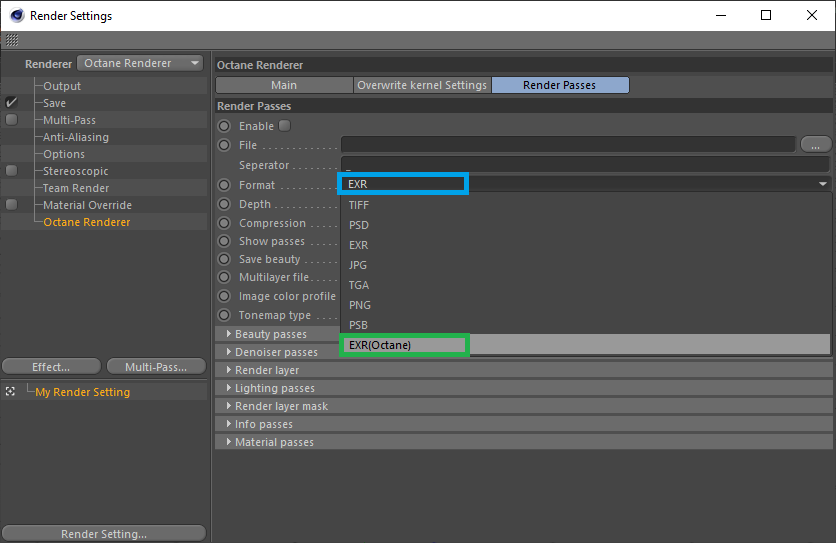 I usually save through C4D because of that. But with for example Render Layers Black Shadow, this is not possible (needs to go through Octane save dialog)