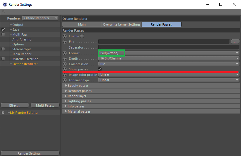 So basically I am asking if its possible to have single non layered EXR files from the Octane Multipass section that are equally (small) compressed then what I get via the C4D save dialog.