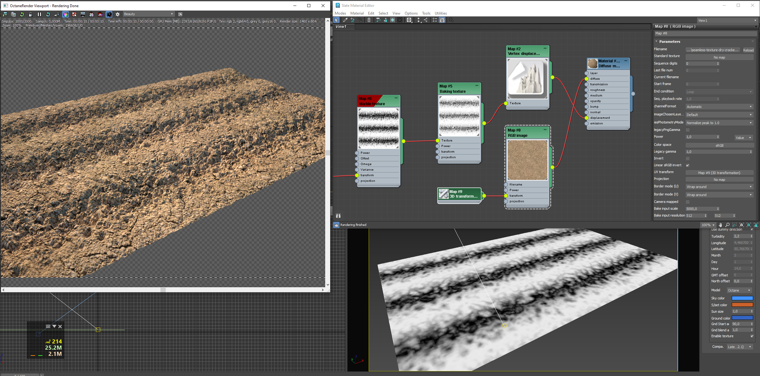 I am trying to create displaced plowed paths using marble and vertex displacement but nothing works. What am I doing wrong? OCtane creates a large scale noise displacement and not where marble texture is. Thanks