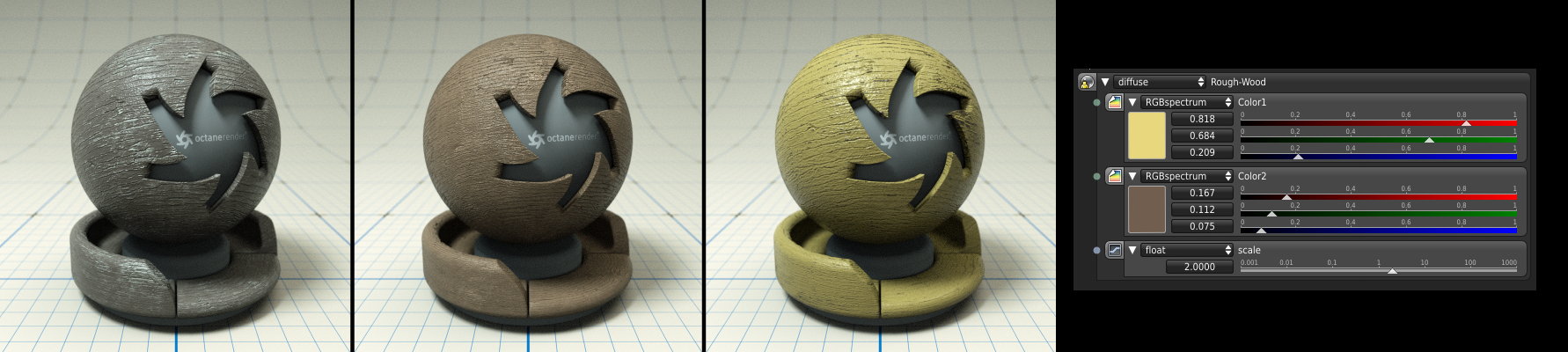 * Materials > Organic > Wood > Wood-Rough A painted rough / old / worn wood material. By tweaking the two color parameters you can create a multitude of different wood surfaces. Scale controls scale.