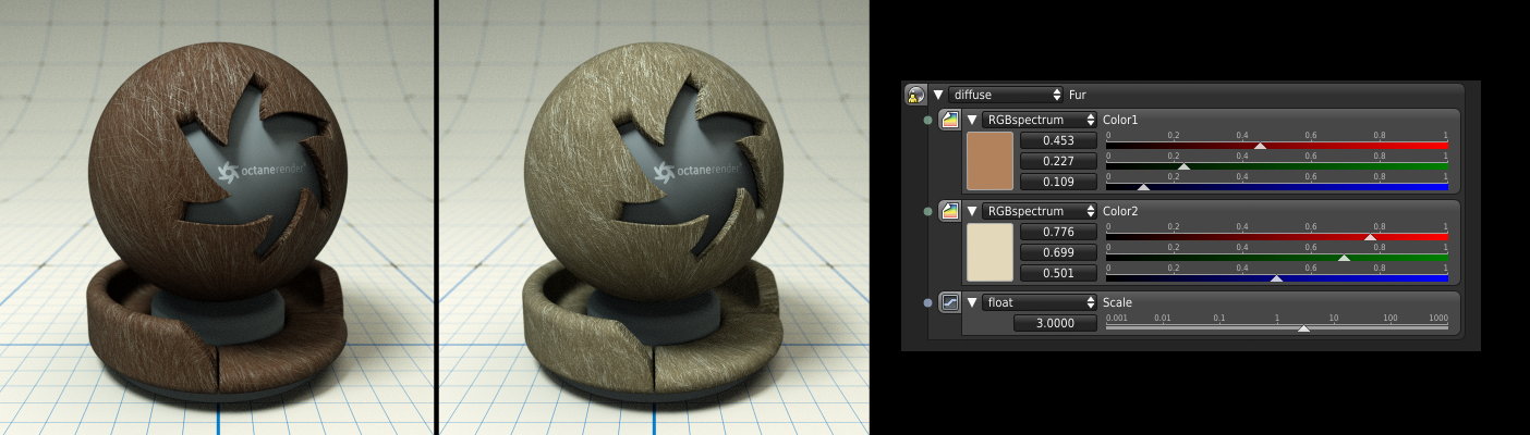 * Materials > Misc > Fur An animal fur material. Tweak the two color params & scale to create different looks.