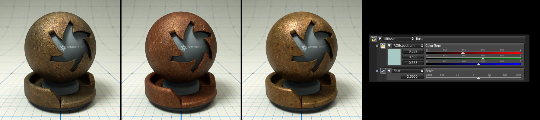 * Materials > Non-organic > Metal > Rust A rusty metal. Use the Color-Tone parameter to give different color shade to the material (desaturated colors looks better) and Scale to tweak scale.