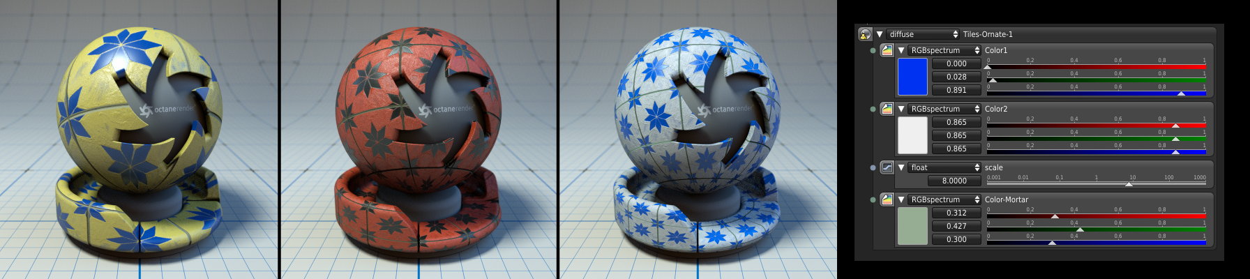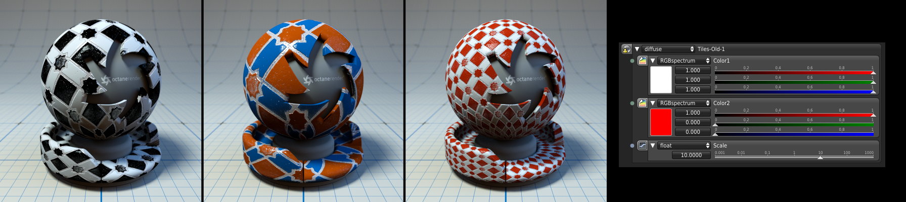 * Materials > Organic > Stone > Tiles-Ornate-1 Not exactly the same tile material I used in the scene, but I have created two tilesets that better accommodate the LiveDB needs (lower memory footprint, more generic use). In this material you control the appearance with two color inputs, a scale input and a color input for the mortar. Just play with the parameters.