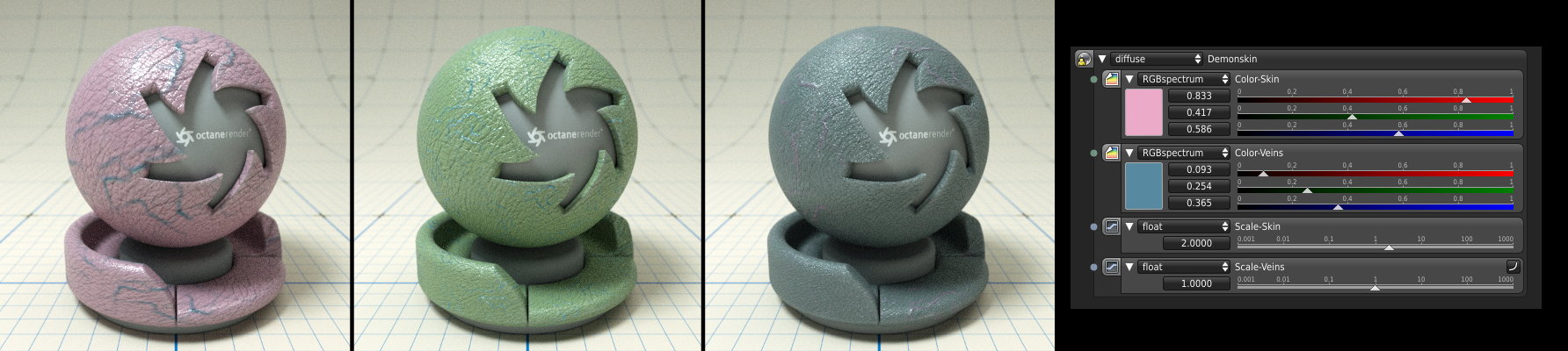 A demonic skin with protruding veins. Uses SSS shader. You separately control the color of the skin & the color of veins. You also have two scale parameters; one for the skin, the other for the veins, so you can easily create a multitude of nasty looking skins. This is a derivative material from the scene for generic use, as the demon skin in the scene uses custom painted maps.