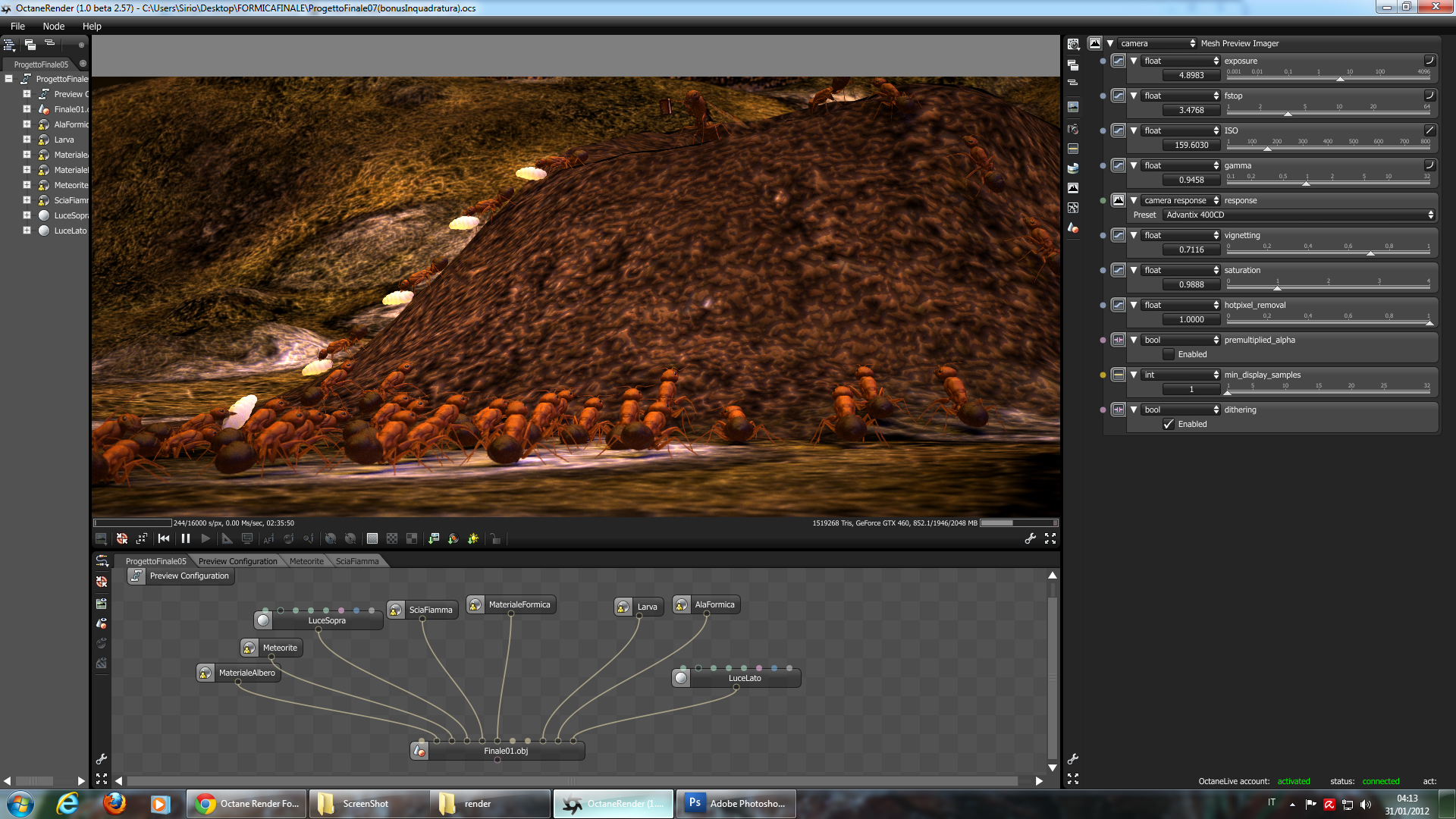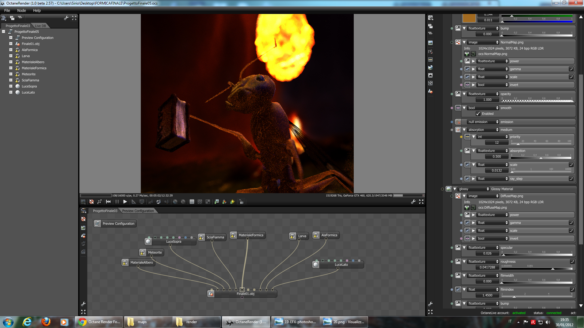 La seconda immagine ha creato un errore che purtroppo non sono riuscito a correggere (http://www.refractivesoftware.com/forum ... 27&t=12807) , ho deciso così di cambiare la scala dell'OBJ originale ingrandendola, perdendo però la traslucenza nel corpo della formica.