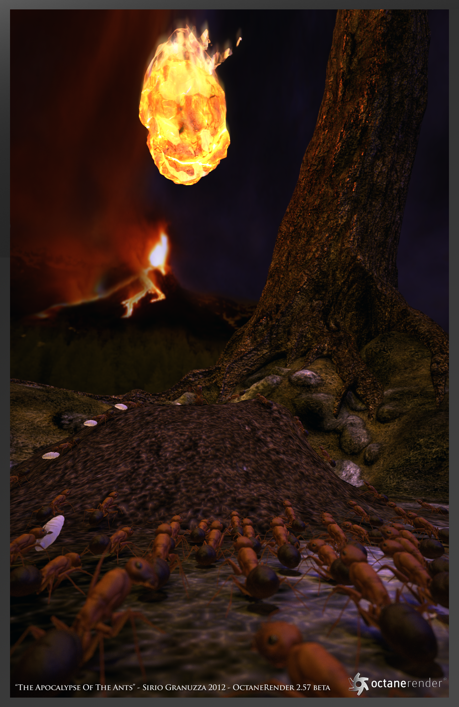 Ho voluto ricreare la scena nel momento prima della distruzione, si vede la formica madre che con un libro in mano predica la fine del mondo, mentre altre formiche portano via le larve dal formicaio ed altre ascoltano il "messia".
