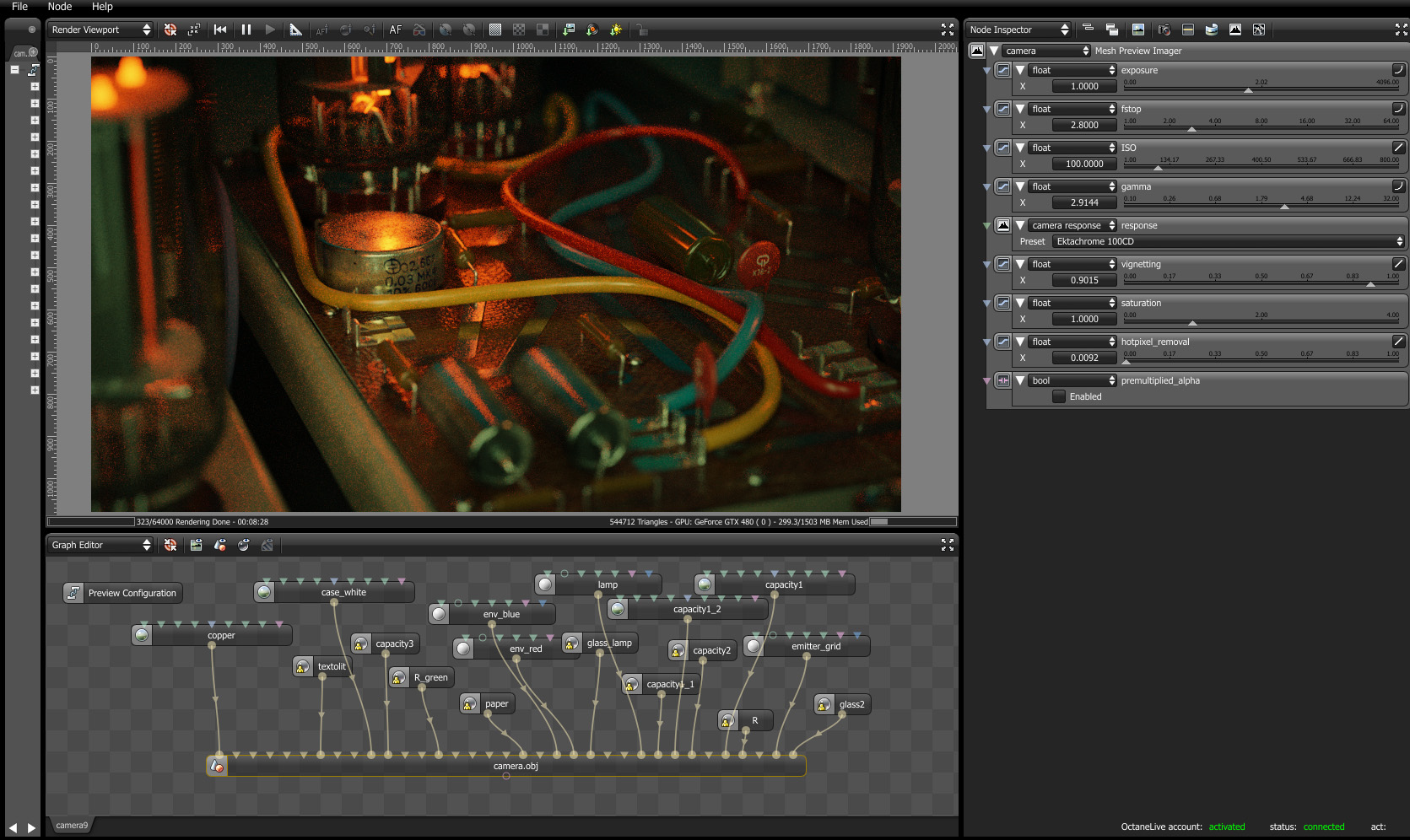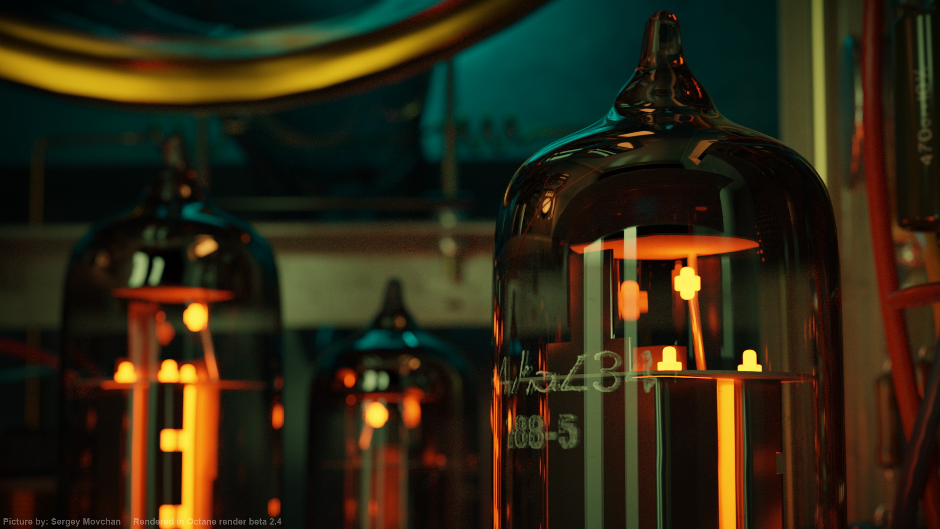 Inspiration: Some time ago we did few effects for documenal film about Vladimir K. Zworykin (He was a Russian-American inventor, engineer, and pioneer of television technology) and this scene was used as background for presenter. It shows inside of iconoscope (early television camera tube). Scene doesn't pretend for any historical accuracy (wrong radio components for that period of time, there aren't holes for elements in plate etc :)) and it's been done for visual purpose only. Main goal of this render is testing of Octane render in hard conditions - lots of complex emitters inside the glass, lots of glossy reflectors and elements, dof. Eventually, I'm very satisfied with results - I couldn't stop myself from taking pictires - that's real "octane magic". Thank you, guys :)
