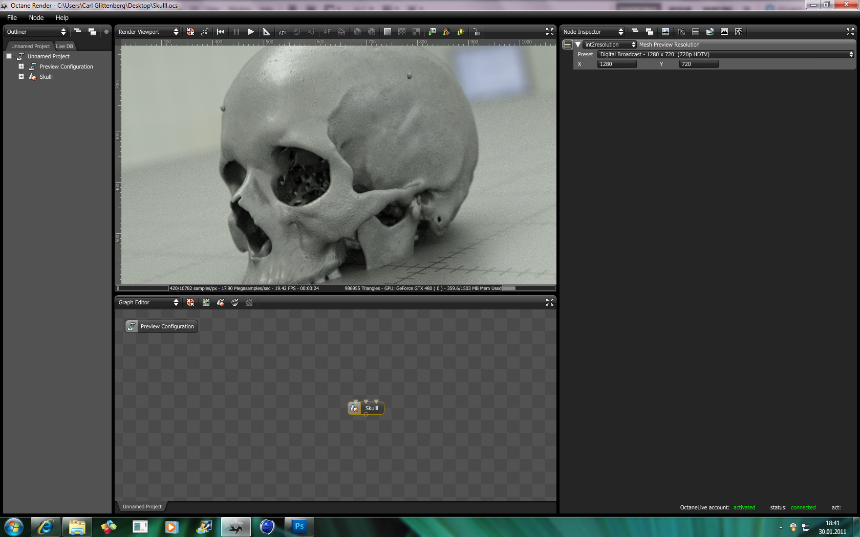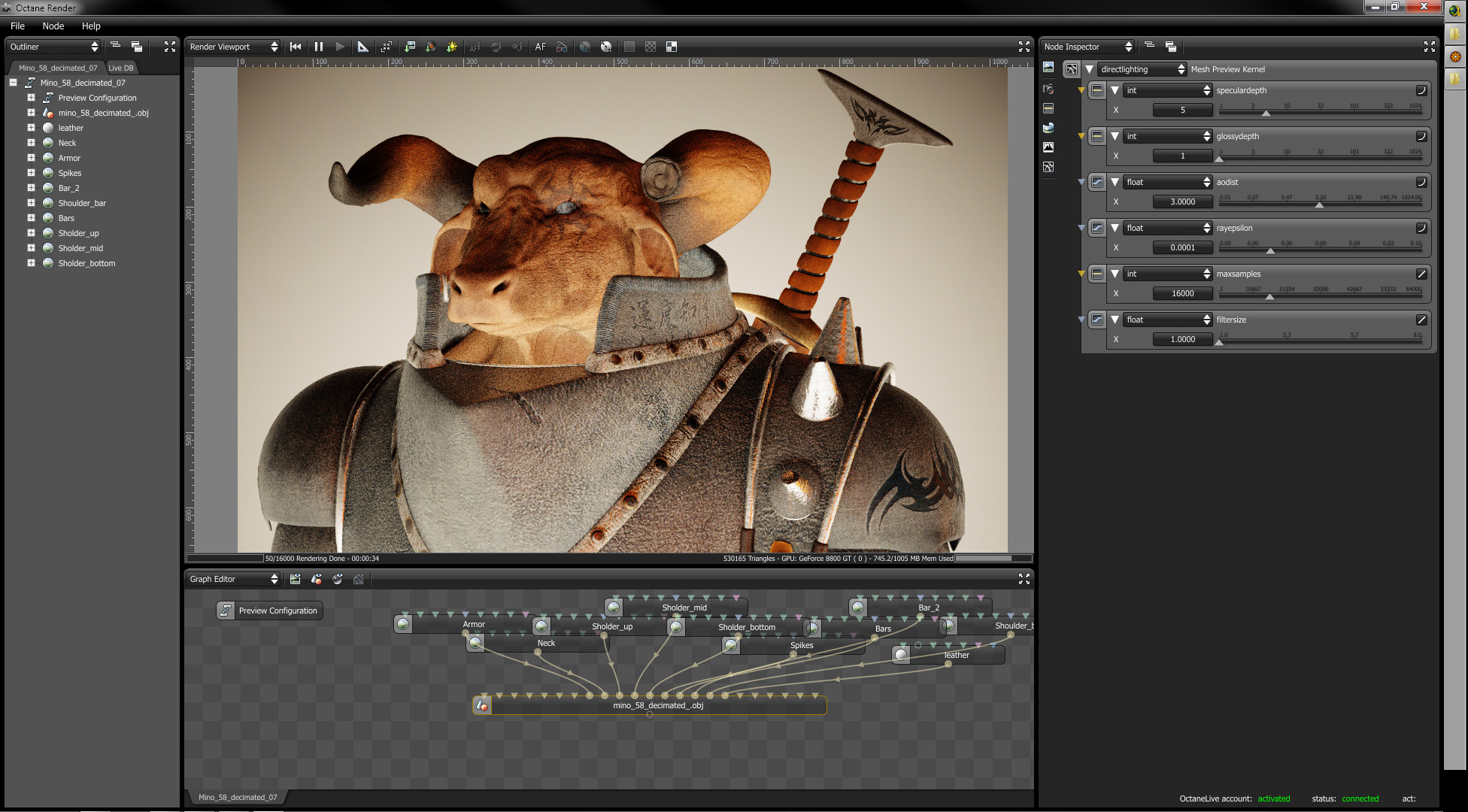 I really struggled with this scene. I had to reduce it several times, because it appears like Octane doesn't like it and crashes all the time, while there was still a plenty of free memory on a graphic card. I didn't figure out what cause the problem. It looks like if the scene exceeds some complexity limit, it start to behave weirdly and the saved OCS file won't load (crashes upon voxelizing). I had also problems with saving and loading materials. If I split the scene in two parts, both were working with no problem. I hope for better next time on my new machine I plan to procure.