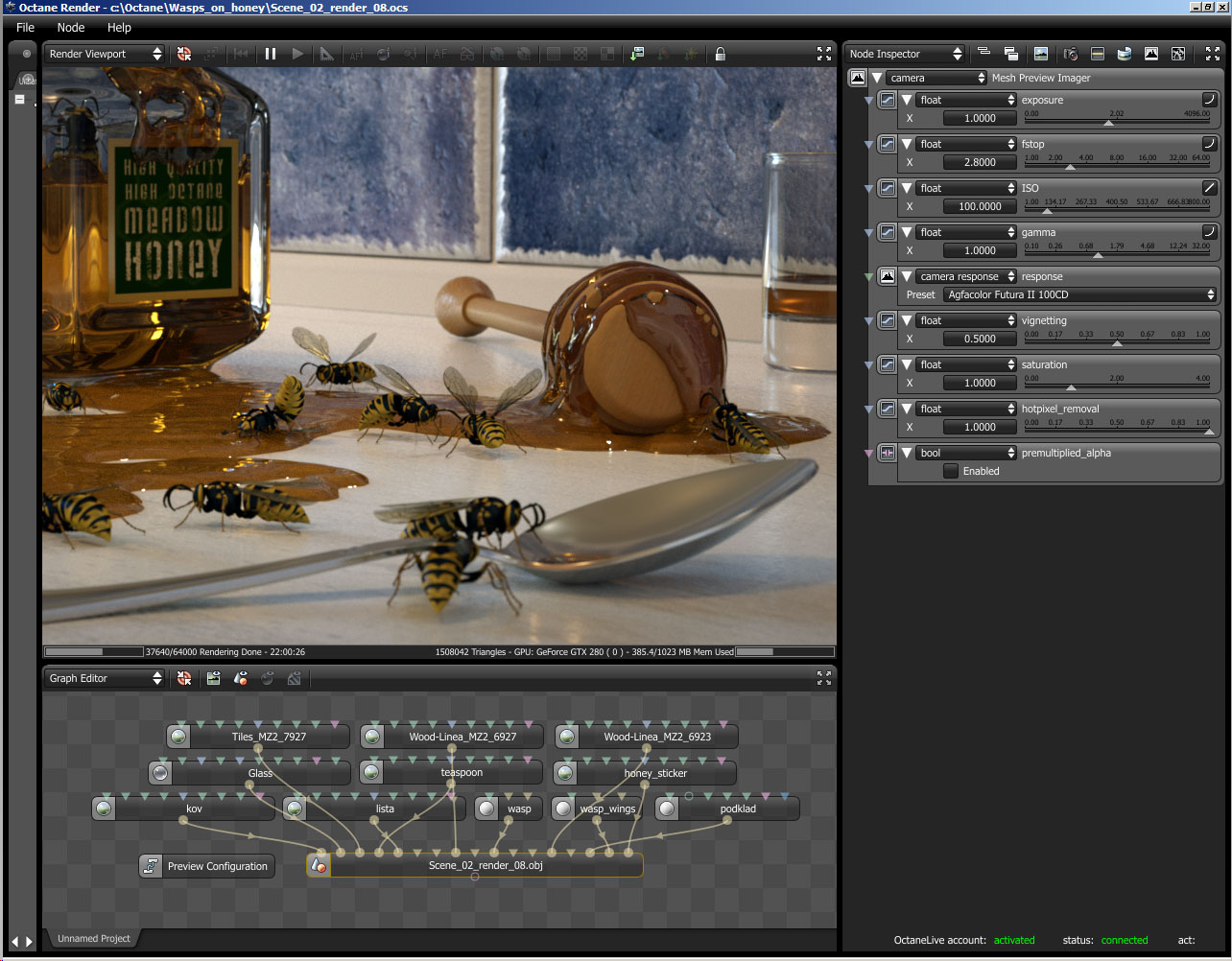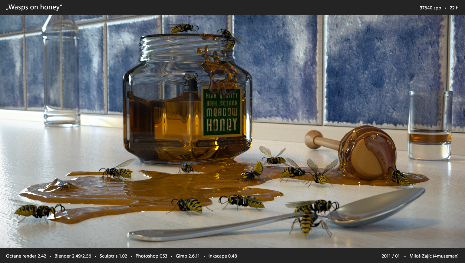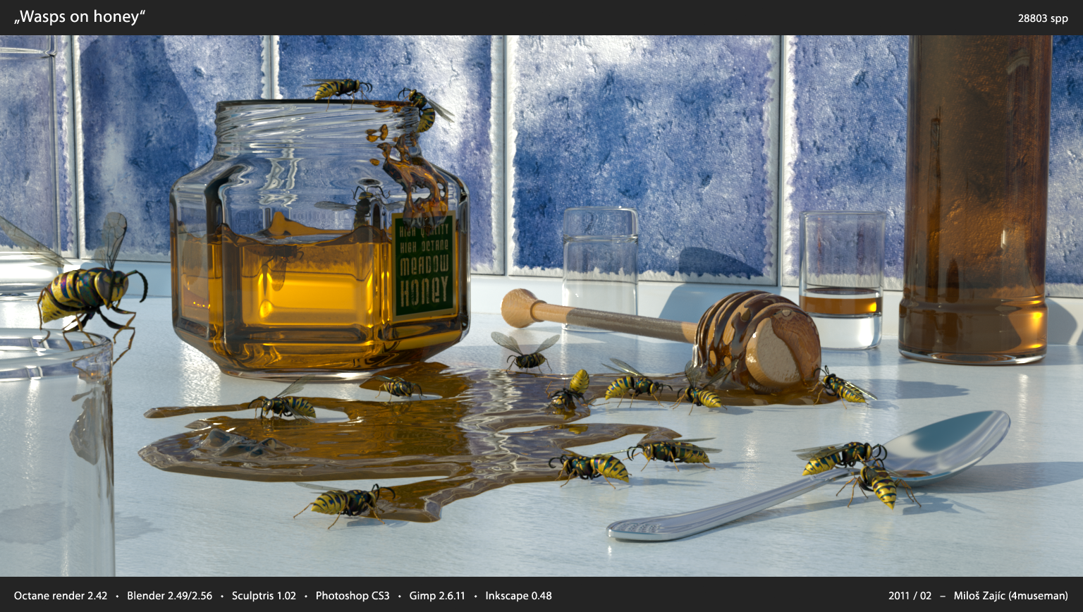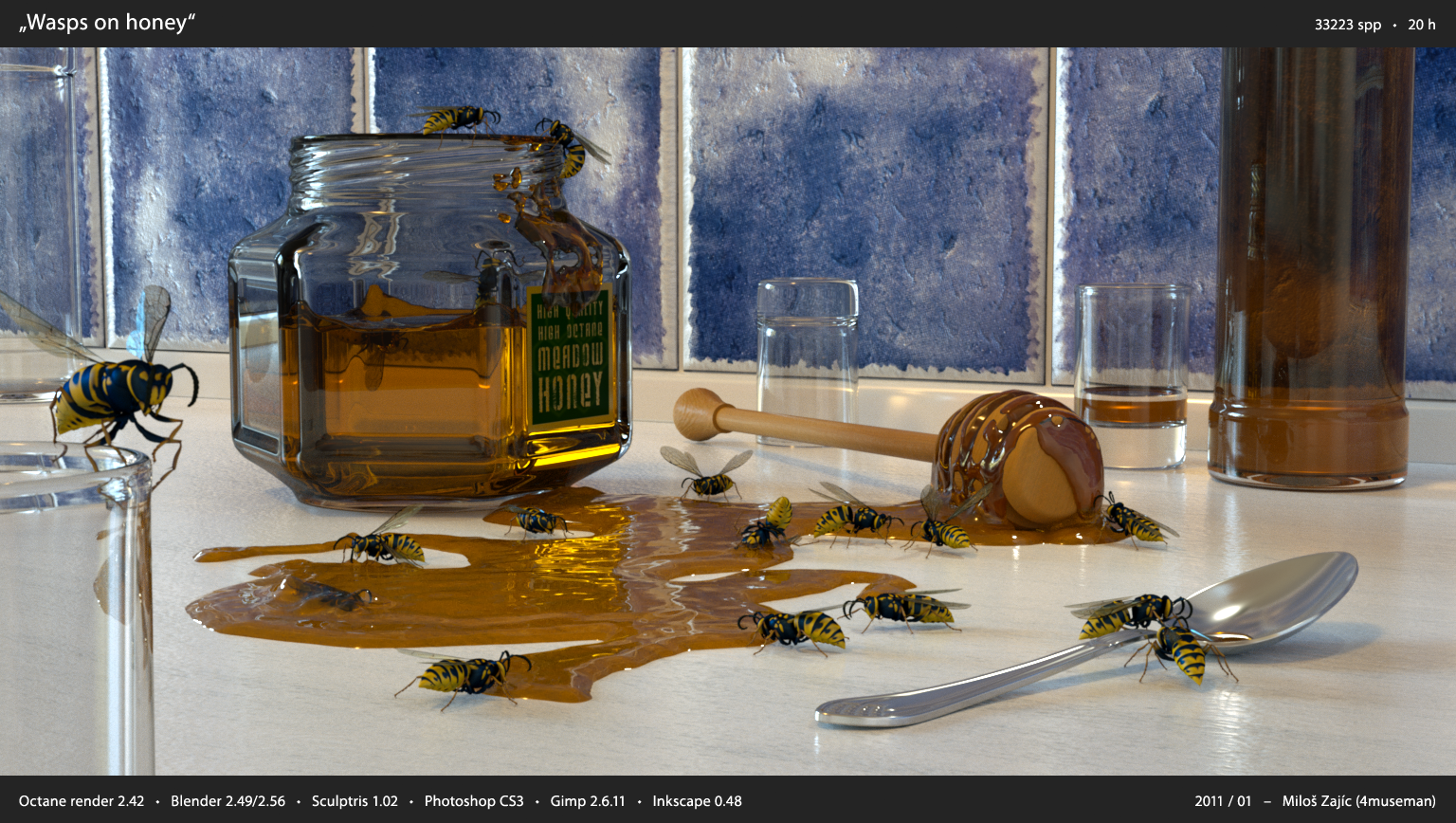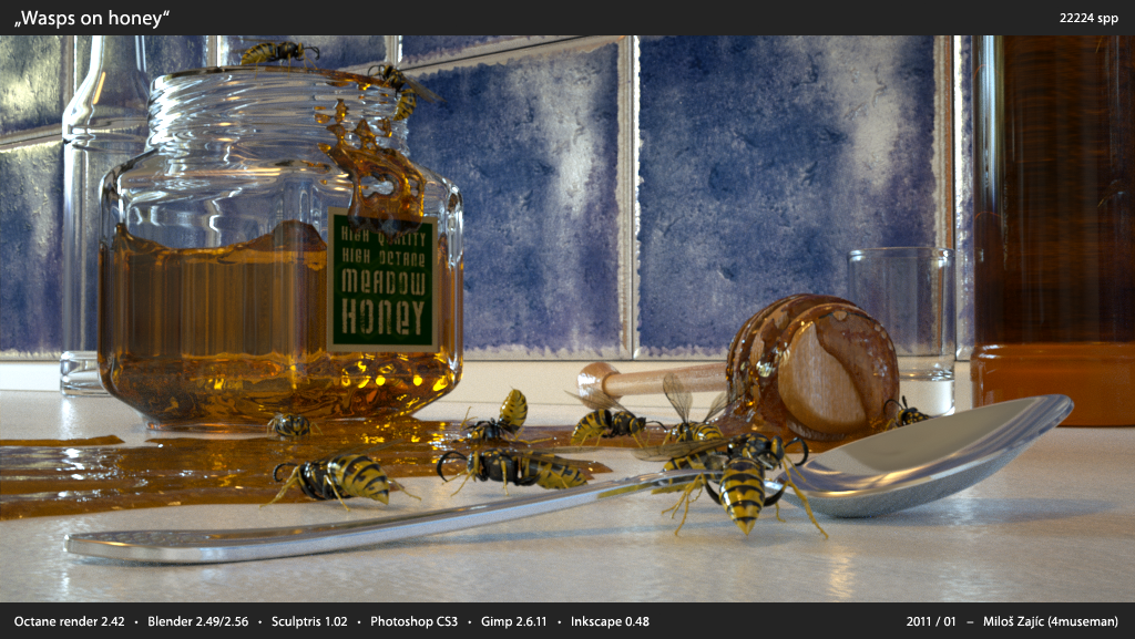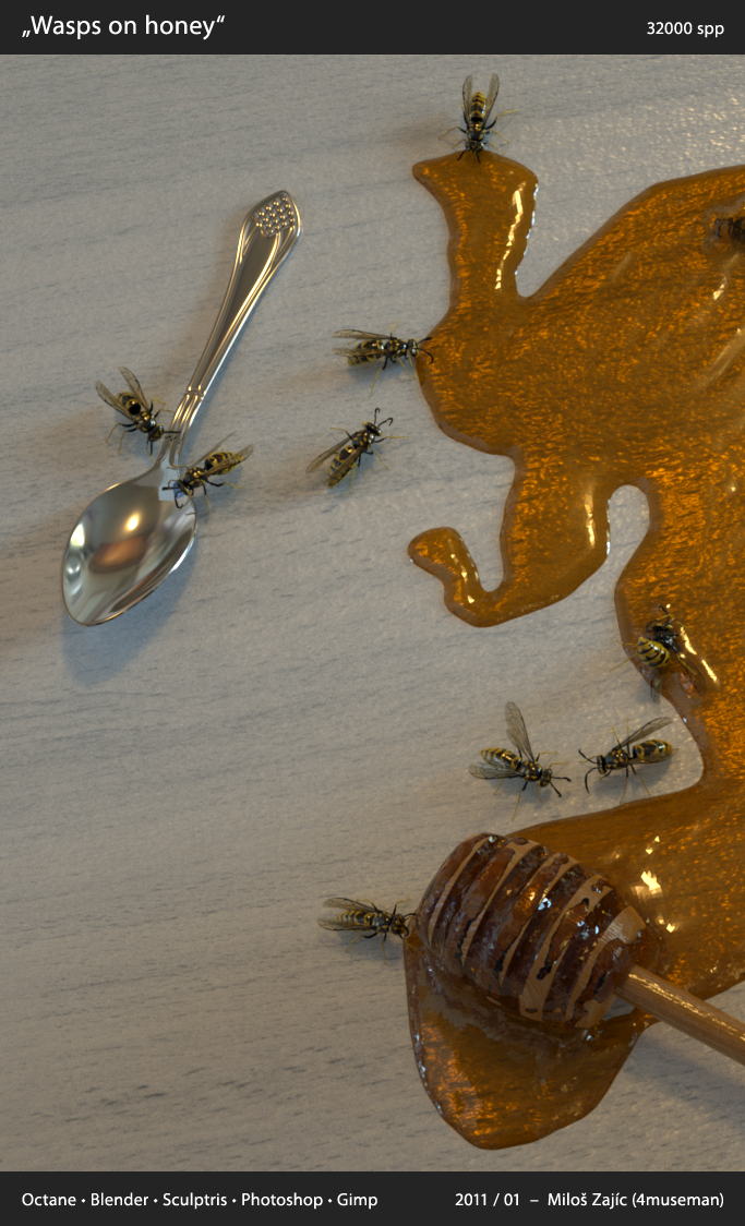 There is very little postpro on scenes with honey, where even with high SPP there was still some noise on honey (because it is illuminated with meshlight - model of spotlight), so I used very careful local noise reduction.