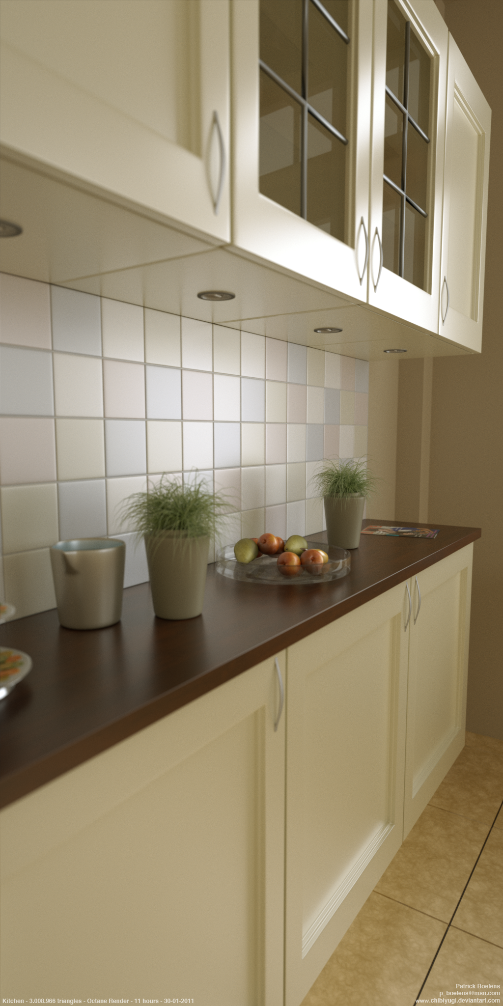 Textures of the small (blurry) fruit portions in the bowl on the left are from CGTextures.com and used with permission. Texture of the cupboard is from CGTextures also and was touched up and color corrected in Photoshop CS5.