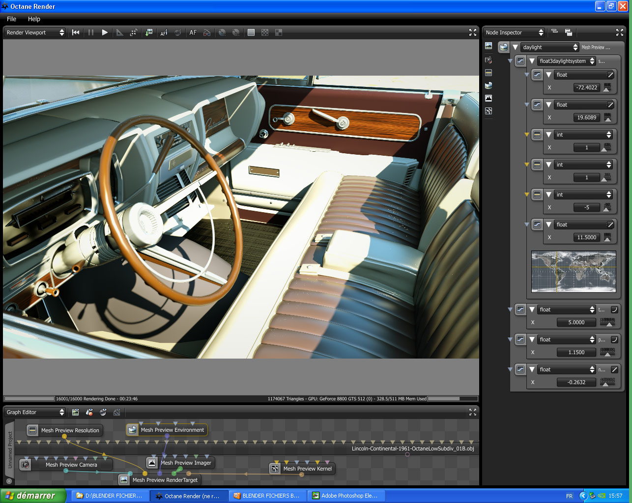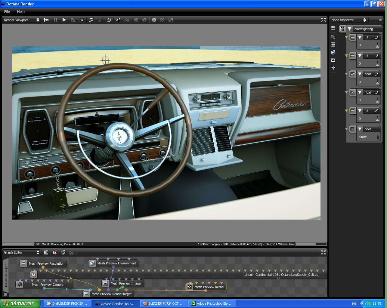 The Image Lincoln-1962_26 has been rendered with Pathtracing in a first step. The lighting was good, but there were too many fireflies and the denoised image was verry blurry. So I rendered it again in Directlighting, and I added this second render with Directlighting on top of the first one, at 70%. Fireflies have been reduced enough and some details that were not very visible in Direct lighting, like details of the clock behind the glass material have been kept.