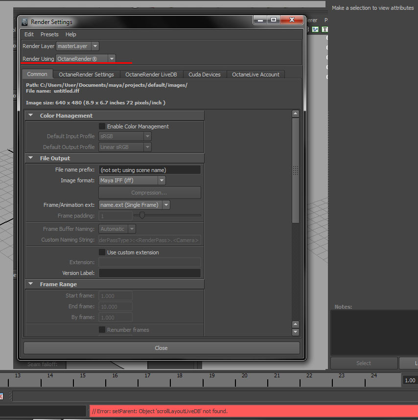 I dont know why, but its happened only on my work PC.. at home its all rigtht.. I'll try to understand what is the reason..I need more detailed info about what you do when you get this message, and the message itself copied exactly how it is. The content of Maya console window will be very helpful to catch the reason of it (with "Verbose mode" enabled in Octane render settings) - you may just post the screenshot if the console has not many messages...
