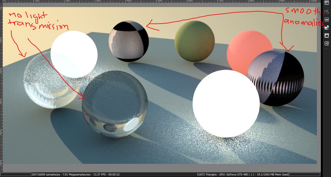 there is no light transmission through glass and still some anomalies related to the smooth bool. no light through glas eally sucks. I've noticed some achieve this in some gallery images and im not sure how they are doing it