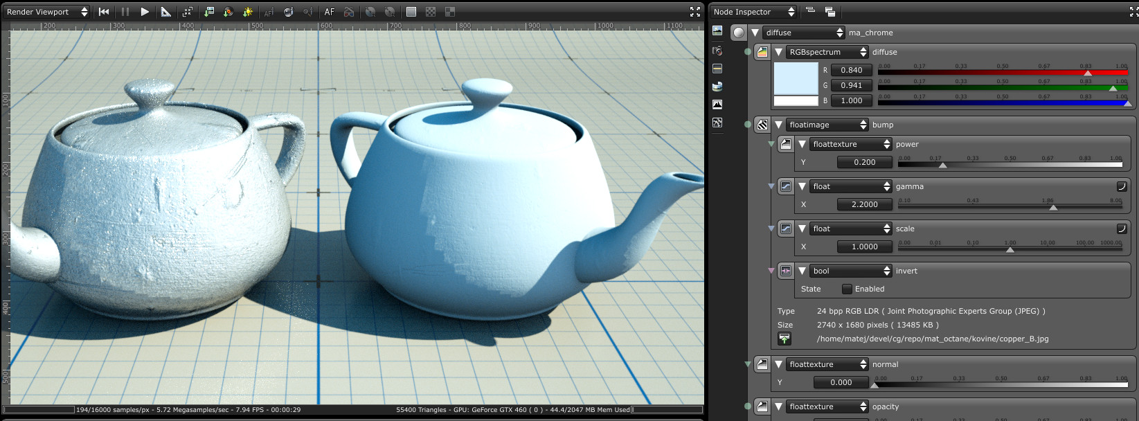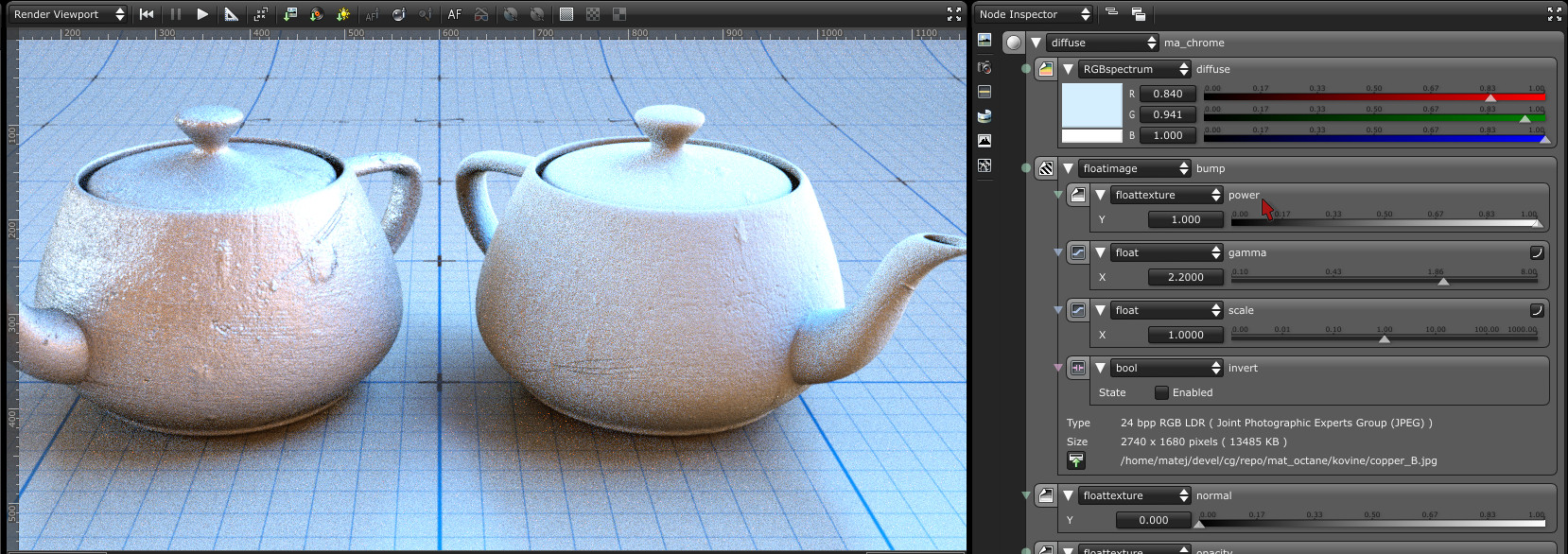 Same scene, exported from Blender, same bump texture used with same scale. Left pot glossy material, right diffuse material: