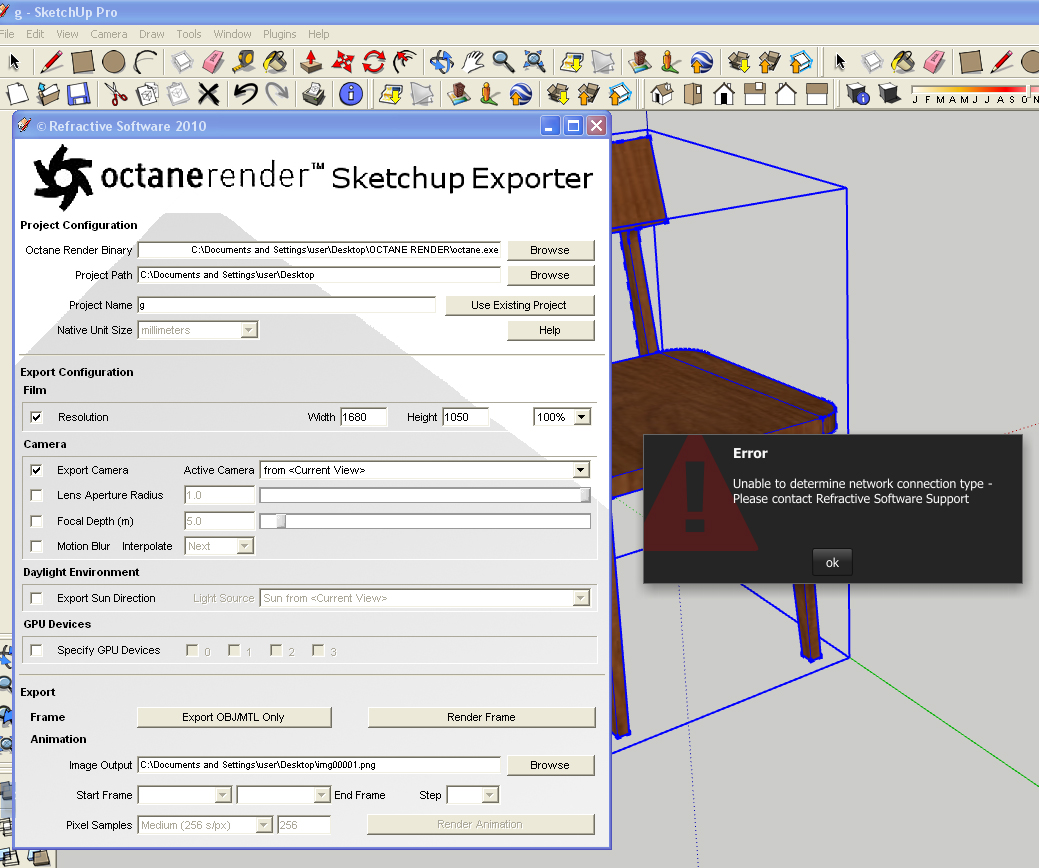 Hi, again nothing seems to work properly.I click on render frame and i get this error message that i allways get. (but when i click ok octane works fine).I still can't see my 3d model in octane though. I've exported the same scene usining the sketchup's exporter and with a little paning and rotation i can see my model just fine. Like i said before it seams like a unit problem cause im also expiriensing problems of very slow rendering times and not very good final resaults.(path traising is very very slow and i mean for a small room scene 1680x1050 at 9000 samples,it takes like 1:30h (i was using untill now the sketchup's exporter for my projects). I have only one GPU gtx 480.
