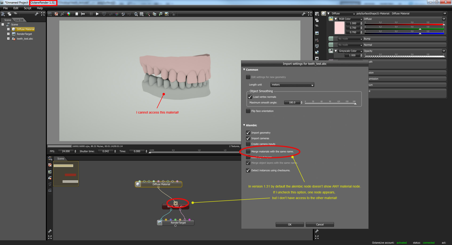 Ok, great!roeland wrote:That's a bug in the Alembic loader, we have fixed in the next release.Rikk The Gaijin wrote:Btw, in version 1.31 I DON'T HAVE ANY NODE for the materials in the alembic file.