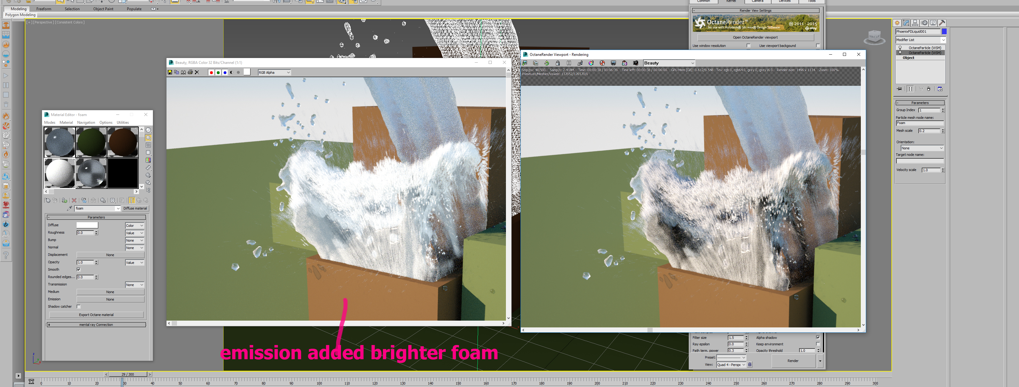 little advise on foam. Since using opacity or fall off is not an option (renderer just slows down VERY bad) use diffuse, 0.2 size foam particles in mesh scale modifier, and add emission of power 1 or less (disable cast light) so you will not get black shadows in foam since it is not transparent. maybe for small stuff like beer it is ok to use real falloff but large scale foam using transparent foam is impossible,