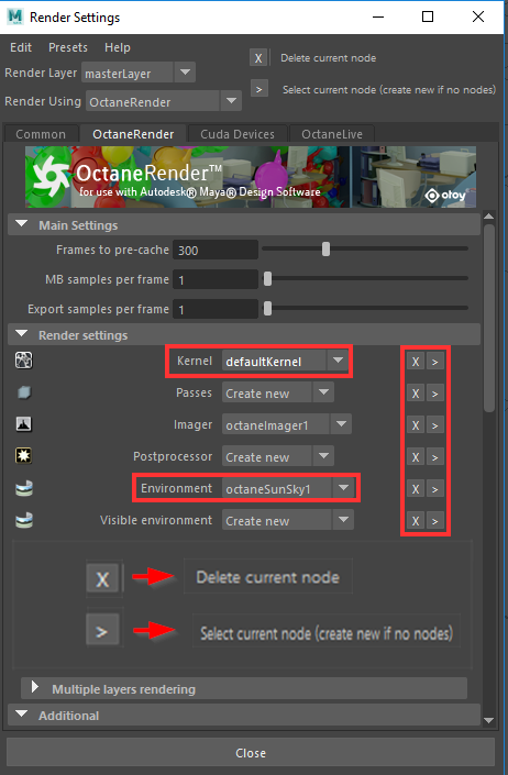 Please make sure you do not click on the "X" - this step would delete/disconnect the Octane nodes as shown in the video.