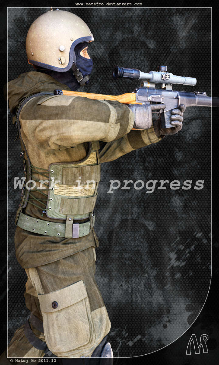 Current WIP of my Spetsnaz guy. The gear & vest is mostly done, it just need some minor corrections. The rigging & skinning was a pain, because the model is composed of various separated parts that are layered (its wearing a tactical vest over the BDU, knee pads, etc.). But I learned a few tricks on the way, so that's a plus. I still have to do an environment and if time permitting (and the competition won't be canceled