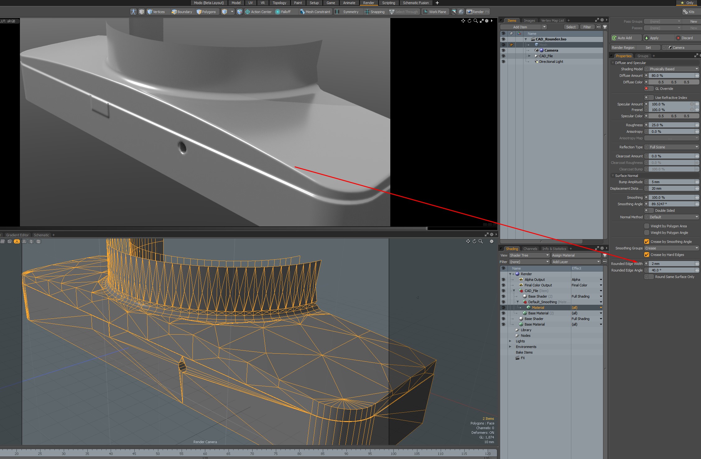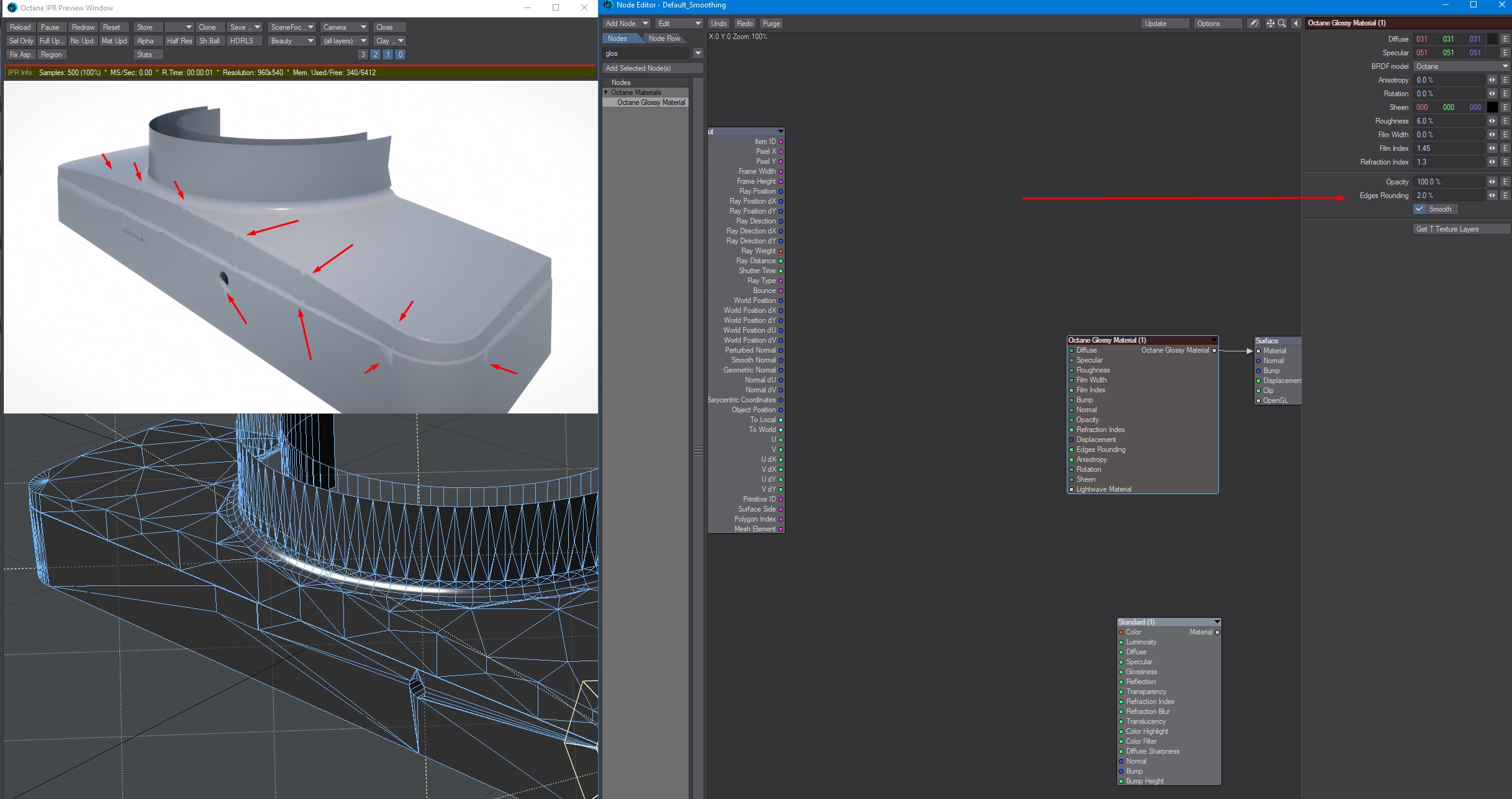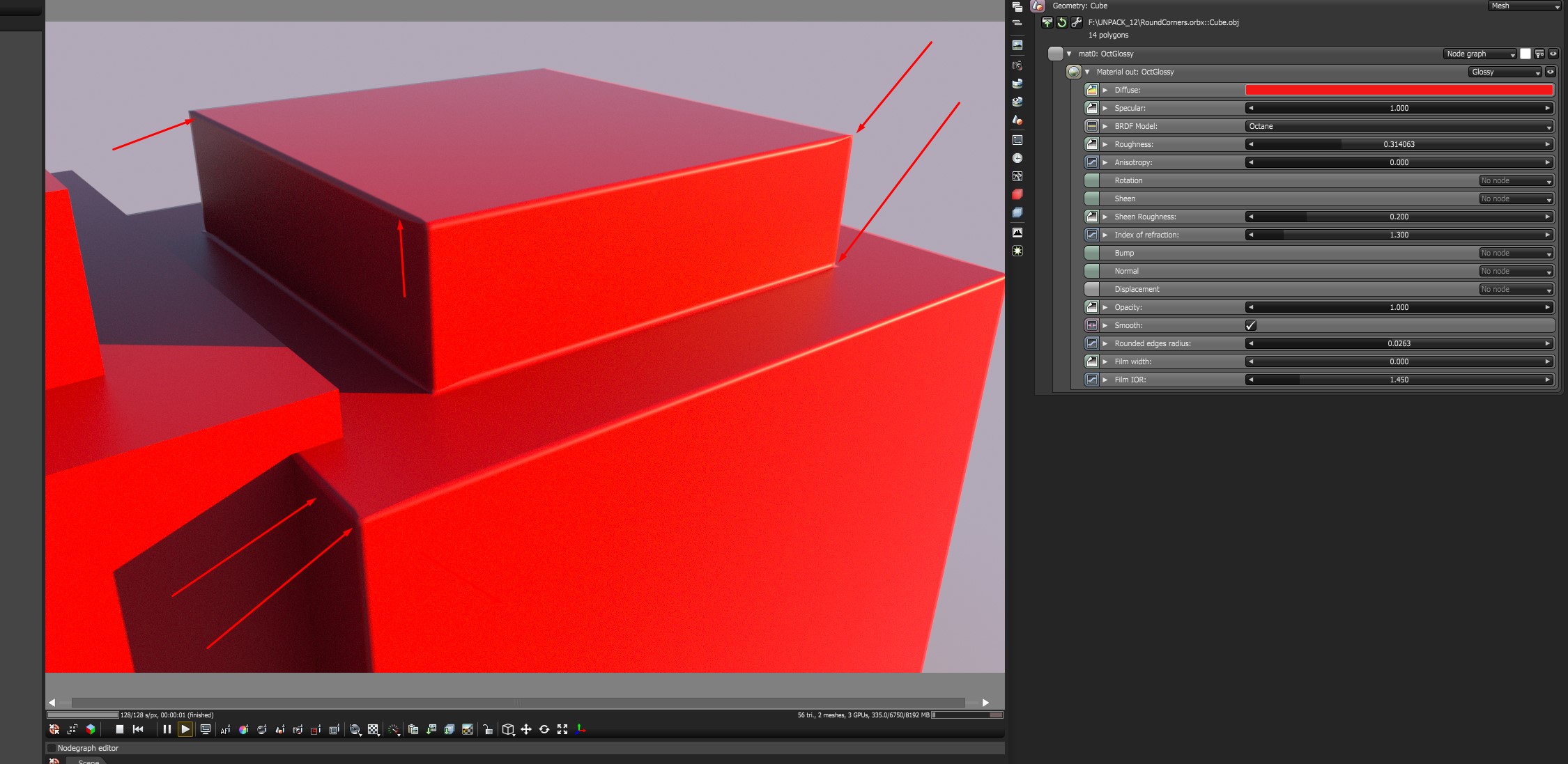 Thanks for example, i see what you mean, basically it works OK-ish only with very small percentage of rounding like 0.01 - 0.02 and mostly on bright sides, on shadow areas it already visible that it's very fake/artifacts.frankmci wrote: Sure thing. The sample .orbx is very simple, single poly per face geometry. Edges made from lots of poly segments will definitely show specular artifacts when the rounding number is greater than, "just break the edge". Here's a shot of the kind of thing I use it for in real life: breaking the edges of small machine parts and such. It's definitely not perfect. For high res still images I'd still model in the tiny bevels/radii, but for animations, the material edge rounding is good enough. Unfortunately, I can't upload the source file for that, but it's the same basic setup.