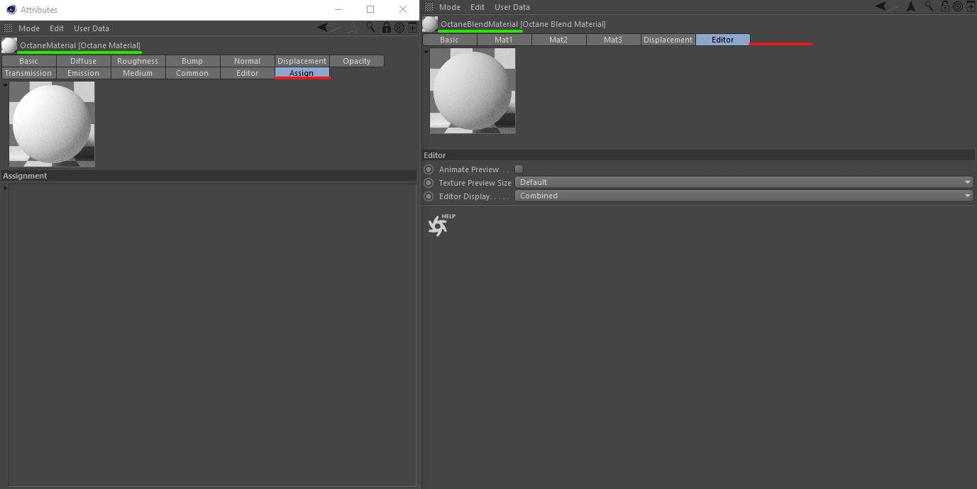The Blend Material is missing the "Assign" tab, where you can see, on what objects the material is assigned to.