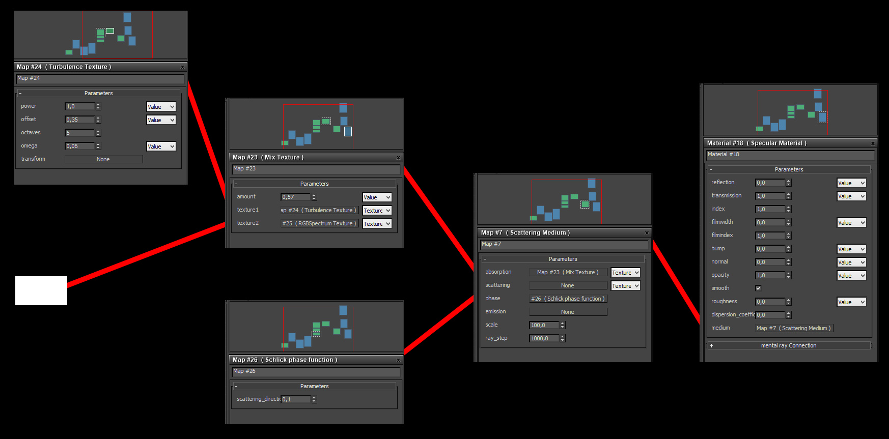roeland wrote:For fog you need a low scattering value, and no absorption. Set absorption to 0, scattering to 1, and the scale input, which is multiplied with these two numbers, to a low value like 0.1.