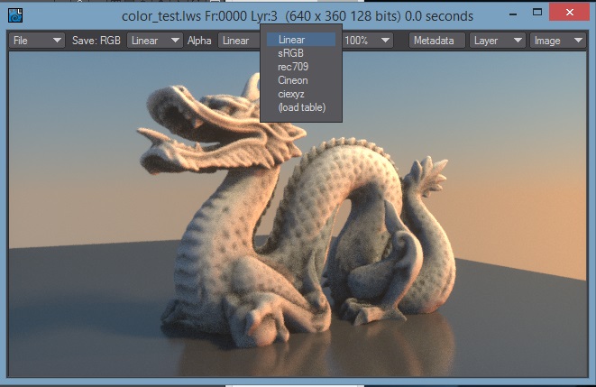 The problem: all is going to work fine with this configuration, but when you render with F9, LightWave is going to enable a sRGB color correction over the already color corrected and tonemaped Octane rendered image. This overcorrection doesn't affect the IPR, the rendering preview window, or the buffers exported from the Octane passes node or saved from LW. It only affects the LW render display window, but you can set it to Linear again in the top menu bar, as you can see in the attached image.