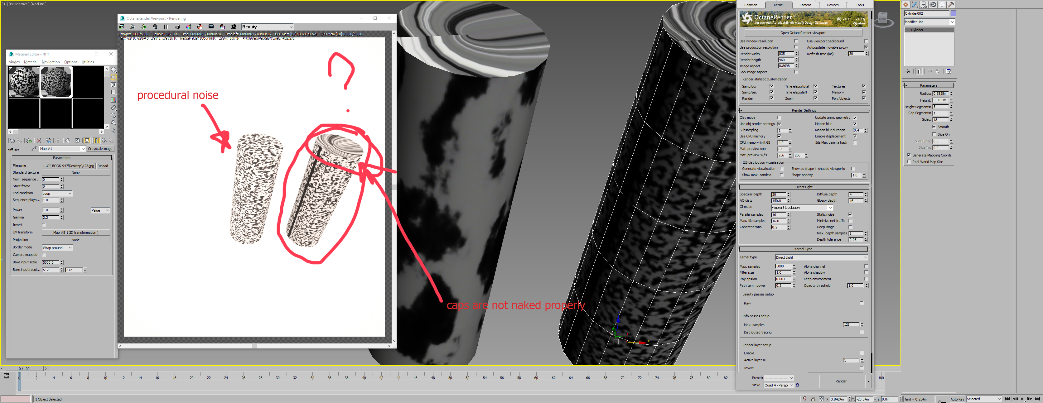 Thank you. We really thought Octane can automatically map for us since procedural textures on cylinder looks fine and it will create a matching bitmap with mapped caps. That's was the whole point for us is not to deal with mapping and let octane do all the work.