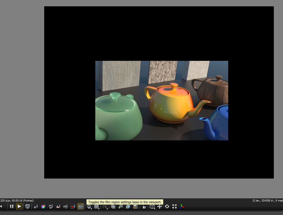 B) Render Region Picker tool allows users to specify a region in the viewport. This assists in viewing changes quickly and also allows more control to reduce noise in specific areas. To use Render Region Picking, click on the icon located under the Render Viewport. Rectangular areas can now be selected in the viewport to which the rendering will be restricted. A feathered border is placed around the selected area. To disable this feature and return to rendering the whole image, click once anywhere in the viewport. The samples rendered in this region are taken into account in the samples per pixel statistics of the viewport. This represents the average samples per pixel over the full image.