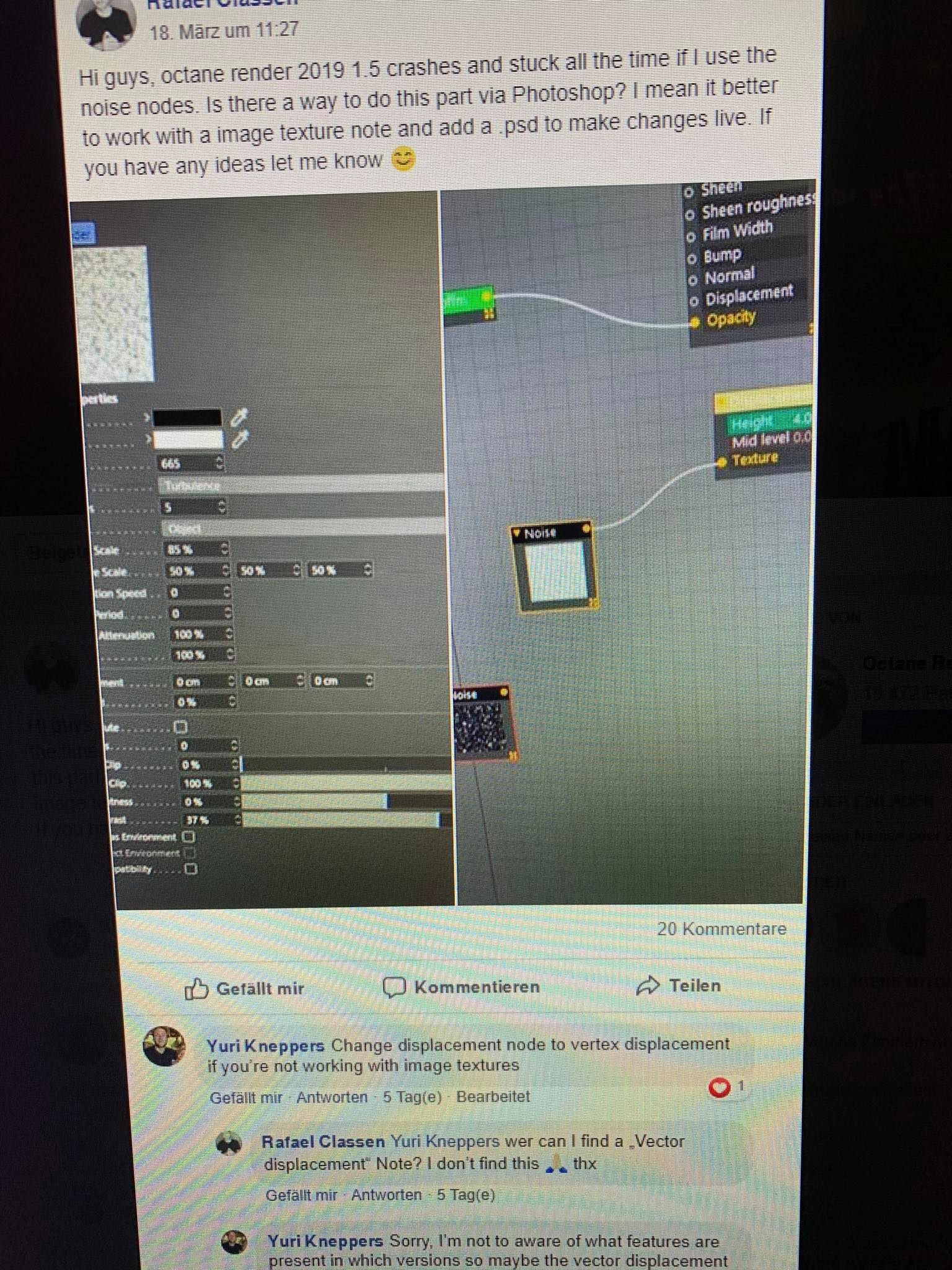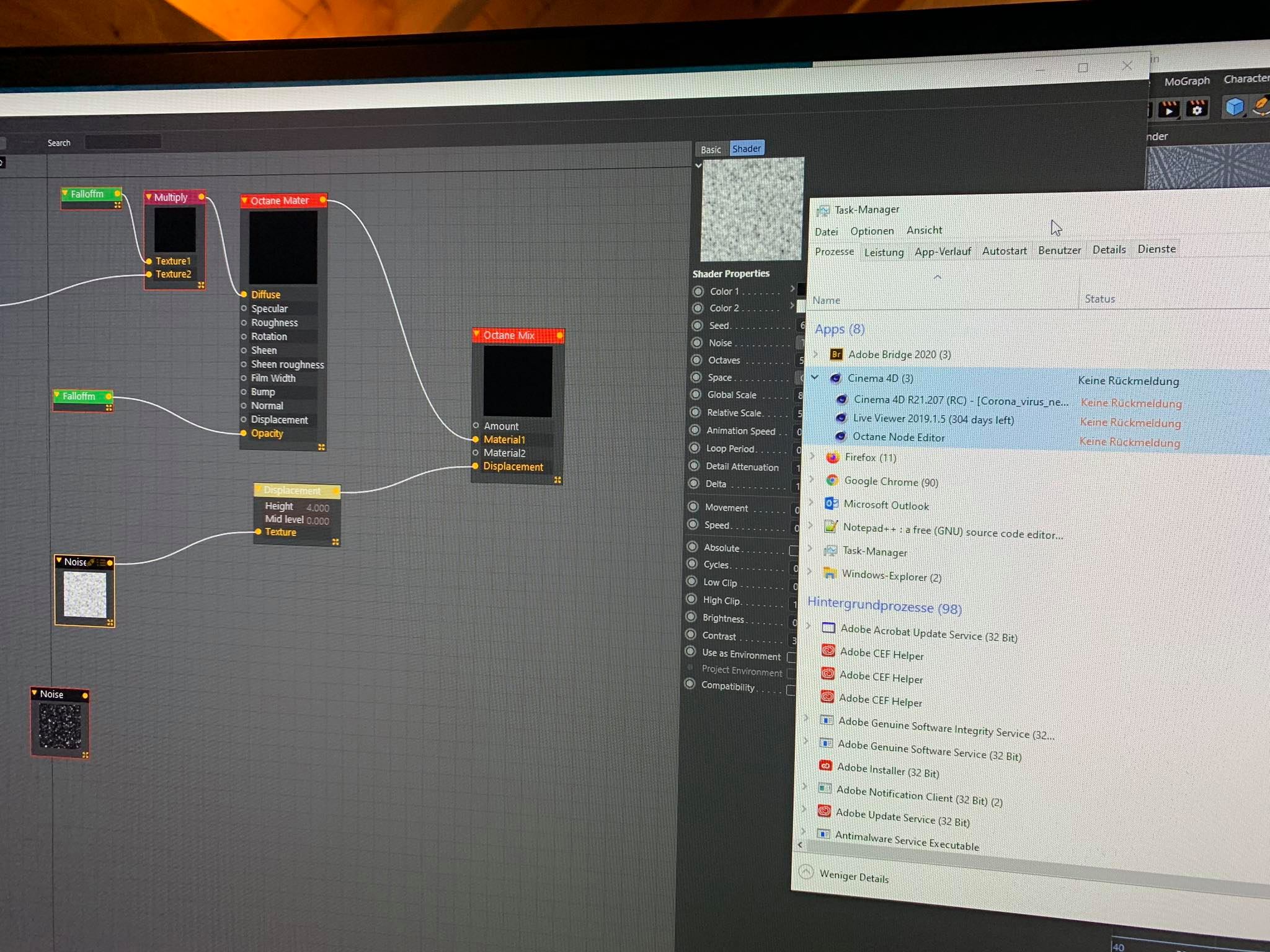 Octane and Cinema 4D R21freeze on every time if i use a Noise node from Octane with Displacment and in a bump. The only way to work is i use a "image Texture" with a image that is like a noise. This works.