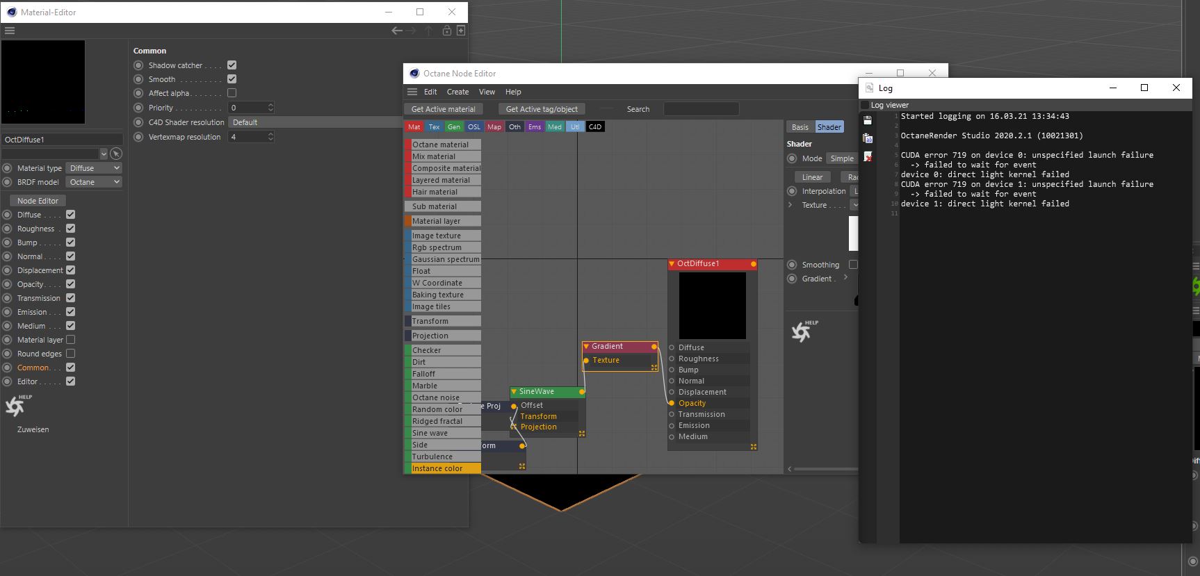I was playing with shaders and diffuse, Octane crashed after activating "Shadow catcher". Please refer to LOG and image.