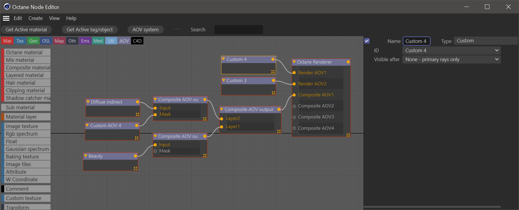 Make sure you have two input pins on the Composite AOV Output node (select the node and choose Add Layer if needed.) Now, connect your Diffuse Indirect node to the Input pin of the Composite AOV Output node, making sure that the Blend Mode is set to Add and the Alpha Operation is set to Blend Mode. Then, Create a Render AOV Output node and choose Custom AOV 4 as the input, and the Output channels to RGB. This section should be connected to the Layer 2 input pin of the Composite AOV Output node.