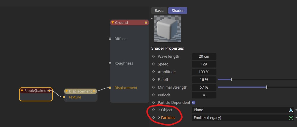 1. Ripple C4D shader ignore Object and Particles fields. Strange but most of the C4D shaders works fine :