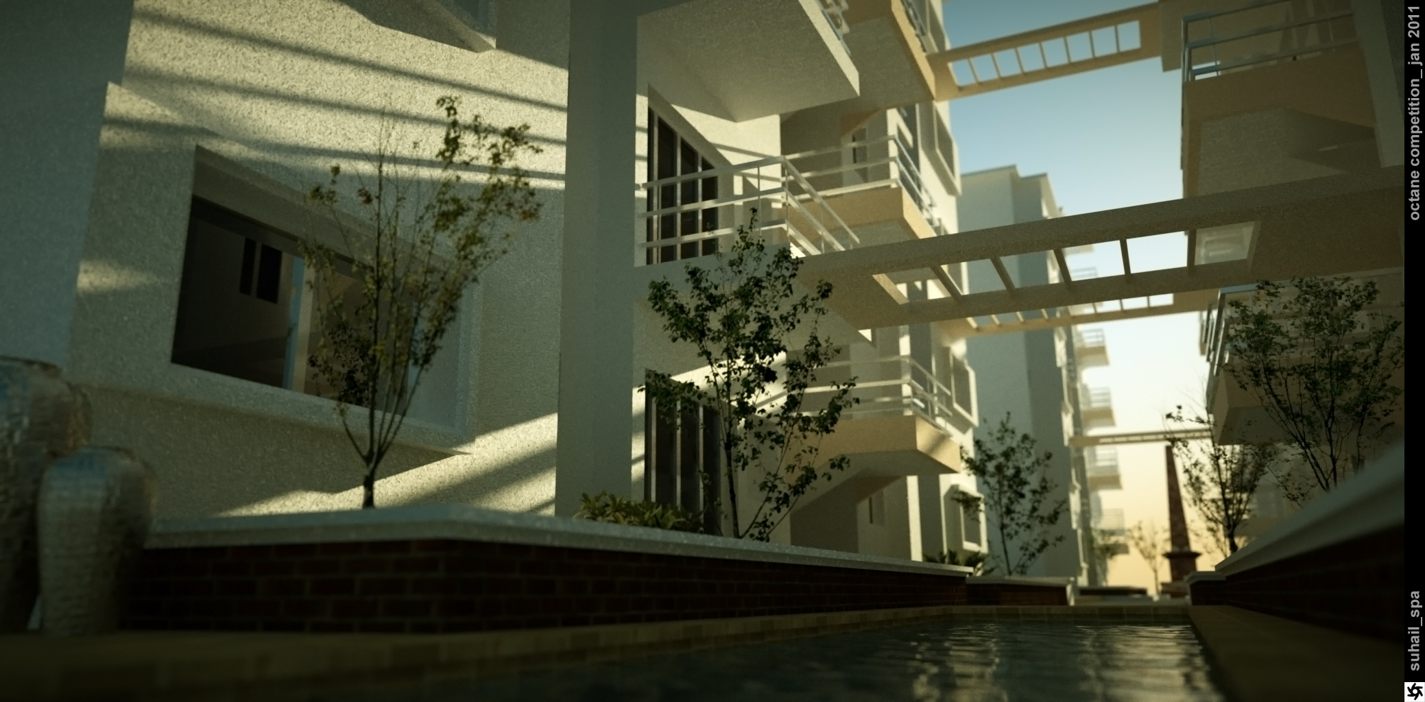description: its a simple scene, a midrise apartment with central pedestrian street- with a small area as reflective pool, and low-height boundaries. its interconnected at upper levels with pergolas to give a more 'enclosed' feel...
