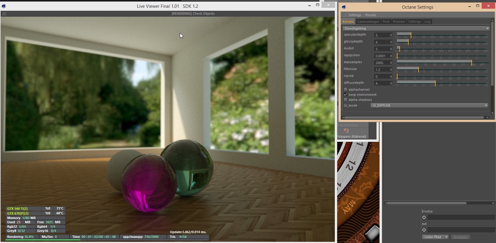 it is weird. Yesterdy I had this bad results I showed but today the same scenes are perfect. Your scene untouched is perfect like yours and my scene as well. I figured out that the problems seem to be related to my big HDRI files (160 MB). Today Octane stated a memory error using such files. Yesterday the same files had no errors but may have been the reason for the noisy results? My graphics cards supply 2GB and 1GB. I thought that should be enouph for handling such fils. But obviously it is'nt.
