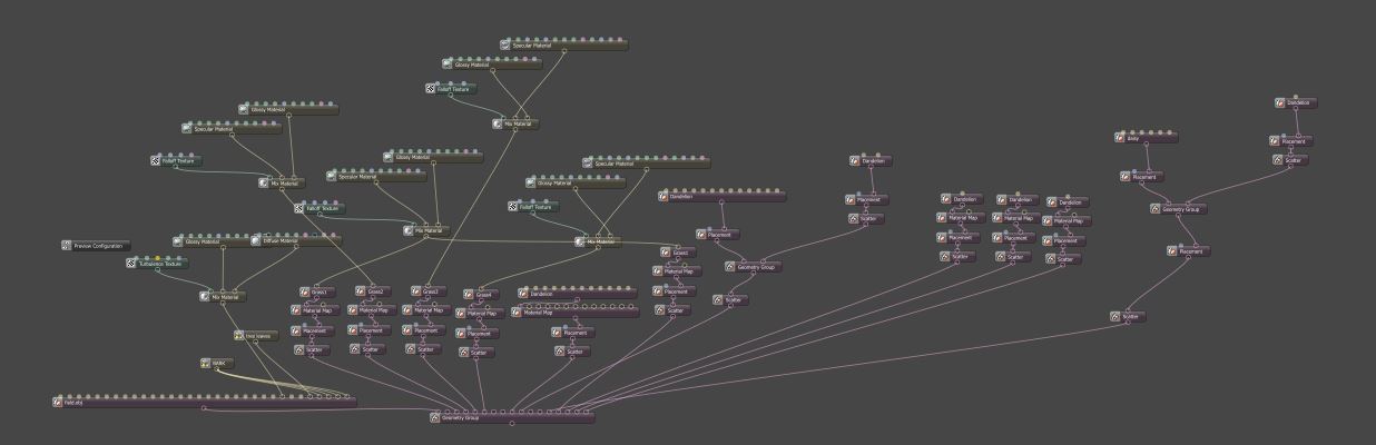 Here's a feature request for you. Can you do something about this mess? Being able to group complete objects would be nice. I use scatter nodes quite a lot and this always seems to end up in a complete mess of nodes with all the materials etc. If I could group all the details of a single object into a node so that I could just pin these nodes together then the view would be a lot less scary.
