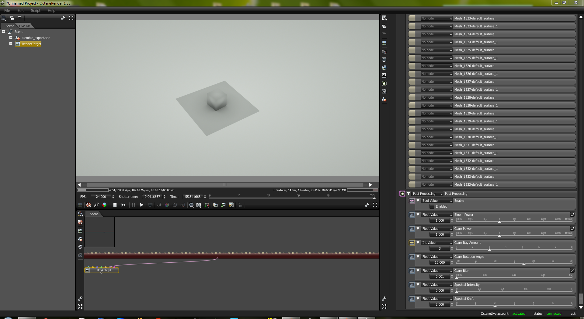Also saw, when you rotate the environment on Z with Octane transform, it turns on the Y axis of blender and not on the up axis. Also too, Alembic for me works only in /tmp\, not at all in other places. In viewport rendering, sometime, the shaders at not rebuild at all or do error and not render. stop the interactive mode, relaunch and all working good as soon as made a new connections in shaders. Shaders also, need a rgb spectrum in mix or float value to work properly, instead not take care of values.