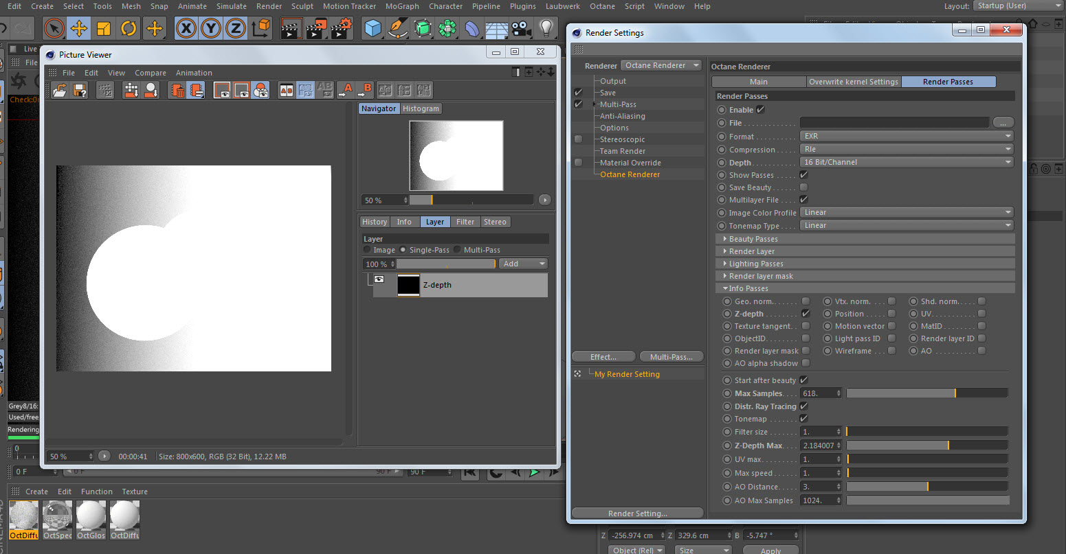 May be better to post your scene because i can render it correctly. At least i suppose that's correct. I can't see anythings weird to me.zoppo wrote: My problem: when rendering in the Picture Viewer with the settings in the first picture the z-depth pass that is saved is the wrong one (picture 2 and 3).