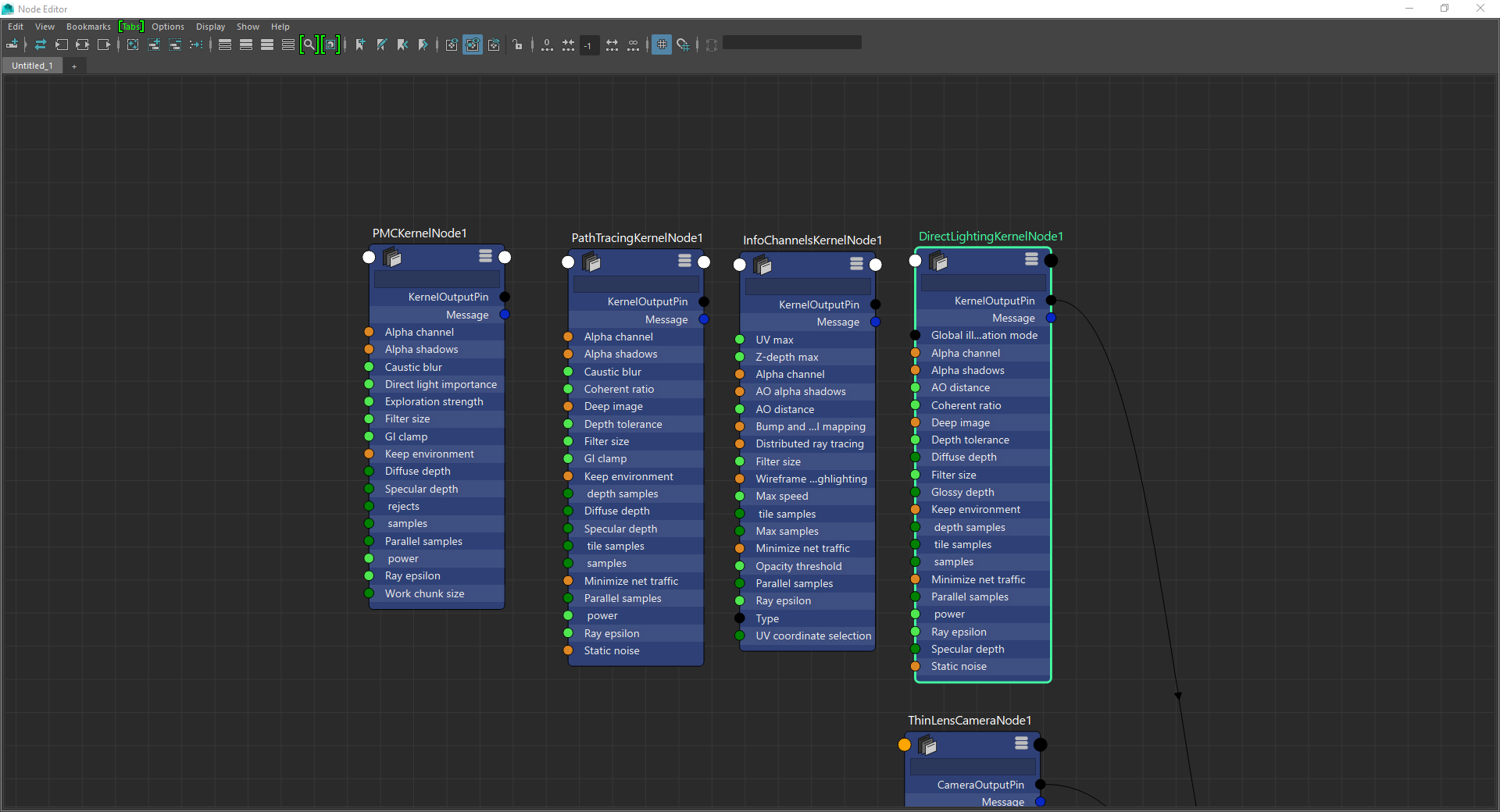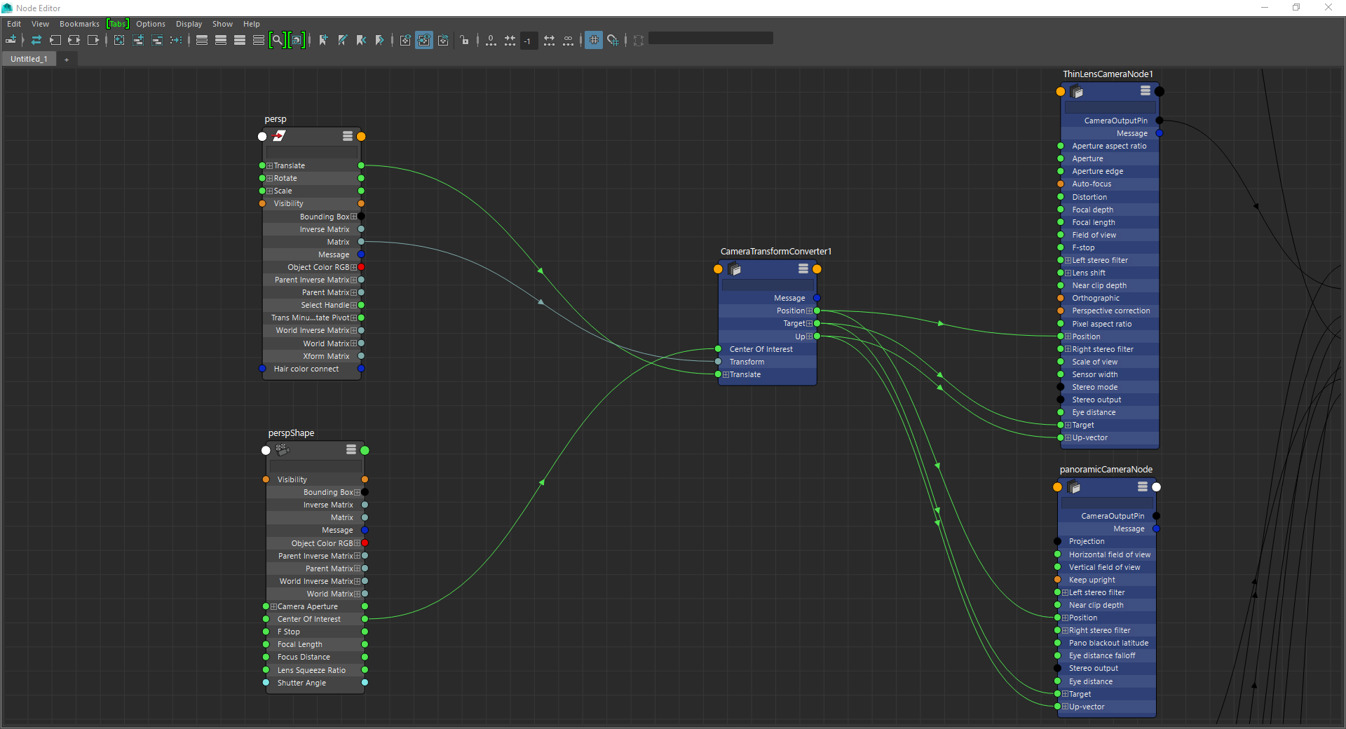 I like nodes for materials and animation, but I hope we can accomplish a lot using only the attribute editor/render settings alone. I'm guessing "ThinLensCameraNode1" would be a tab of the camera transform along side persp and perspShape instead of a frame inside perspShape like it is currently. ThinLensCamera does sound like a job for the shape node, but I guess a single additional tab is fine too (I suppose CameraTransformConverter1 is auxiliar and doesn't clutter the attribute editor). I wish that some related parameters are smart enough to be read from maya, like focal length from perspShape and "scene scale" (or "rayepislon") could read from Maya's working units (cm, meters...). I think mental ray is one that have "derive from maya settings" in the materials for example.