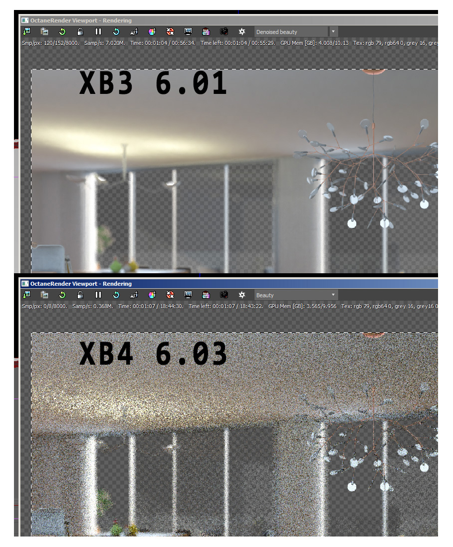 With XB4 6.03 my render is very slow and I even can't go to denoising phase as it is too long.