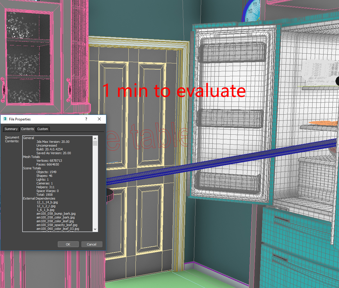 2. I also have another scene with 1549 objects in it and total just 6.4 million polys. Even with Use obj render settings off it takes 1 min for scene evaluation.