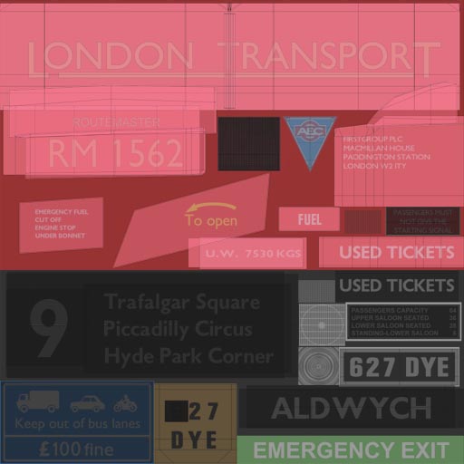 I use very few textures (less than 10). Individual textures are necessary for tileable textures like the front grille, or complex like the platform floor or the advertizing billboards. Most of the textures of stickers, plates... are on the same 2048x2048 image on which I use every smallest surface available. Textures are very optimized on this project as the bus will be integrated in a city scene, it is most important !