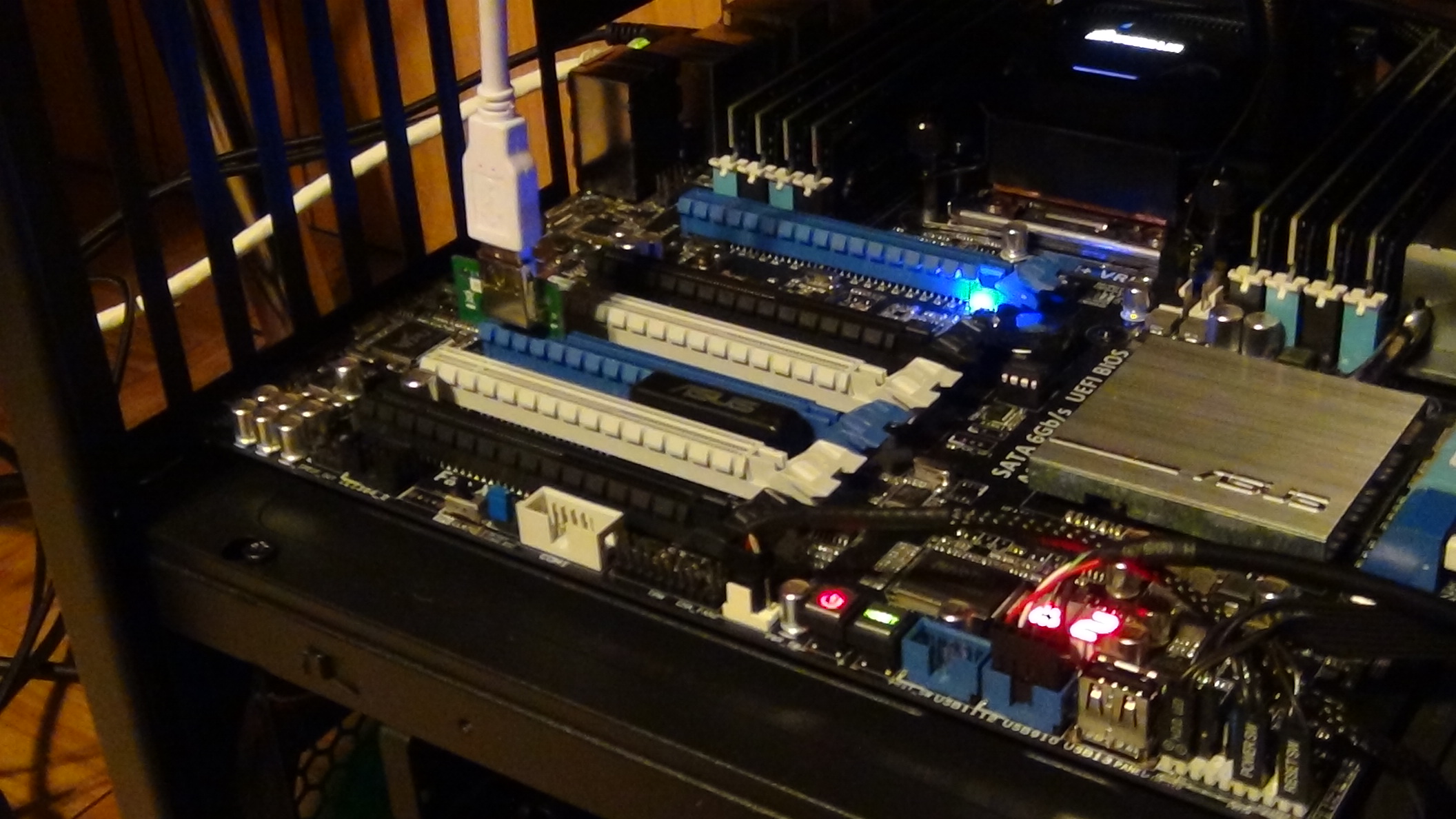(2) I hooked up 2 of the cards on one of my external PSUs to an outlet on a separate circuit via an extension cord to see if this was all a power thing. But no good, cards powered up alright, still same "bF" error.