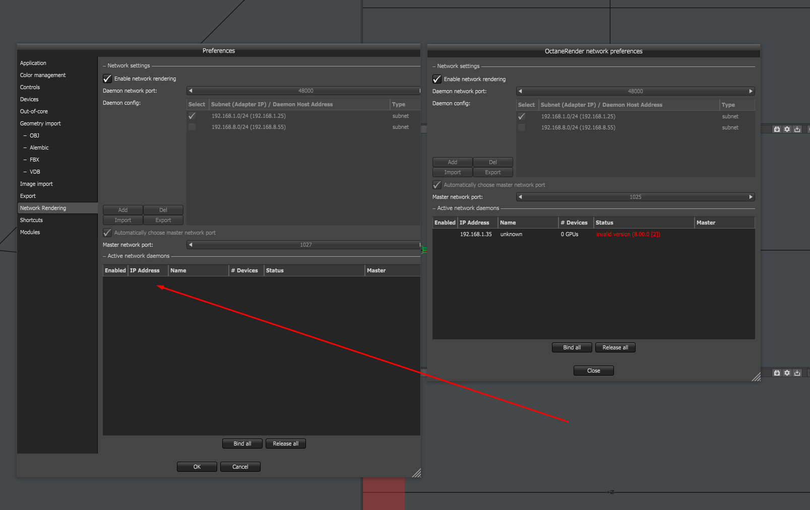 I have BAT file working and if i open network render from Plugin side (LightWave with 2019.1.5 octane - right window) i see my slave (yes it reports that slave has wrong version but main thing is that it sees it), if i open network rendering panel from Standalone i see nothing in my slave list ? That way i'm sure my *.bat works and it's correct but for some reason Standalone see nothing on that list ?