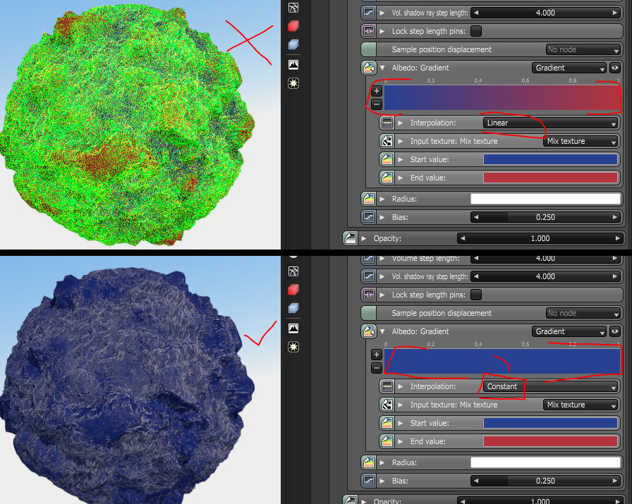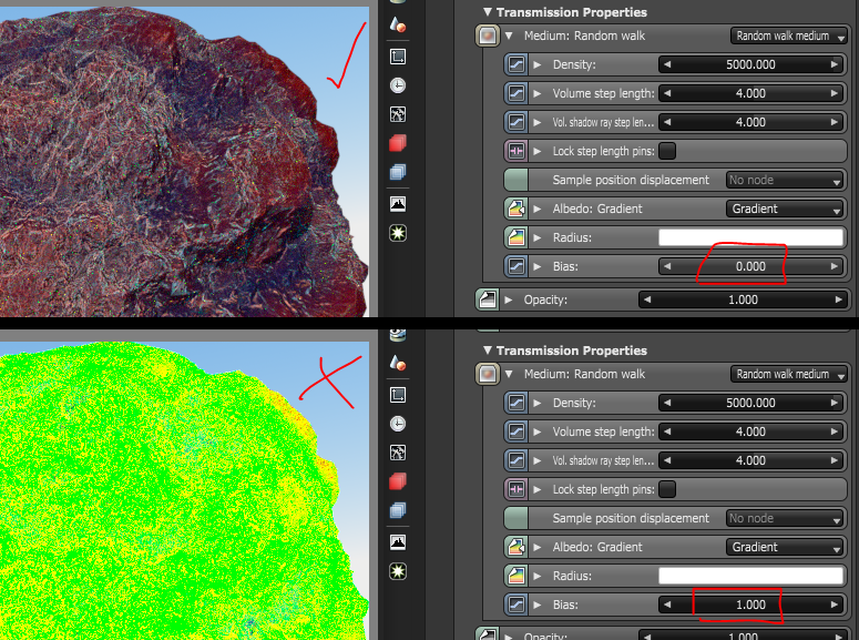3. Change the medium random walk > albedo > gradient interpolation between constant and linear.
