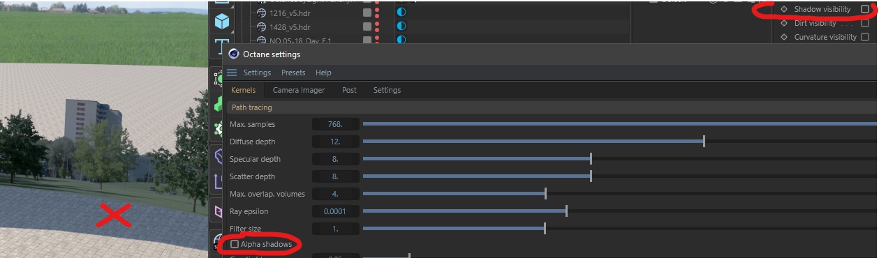 Please see, there is still issue with Octane Object Tag shadow visibility on objects with materials that have opacity channel. Shadows are still visible until Alpha Channel in render settings is not turned on.